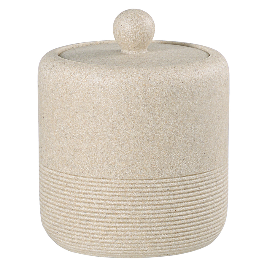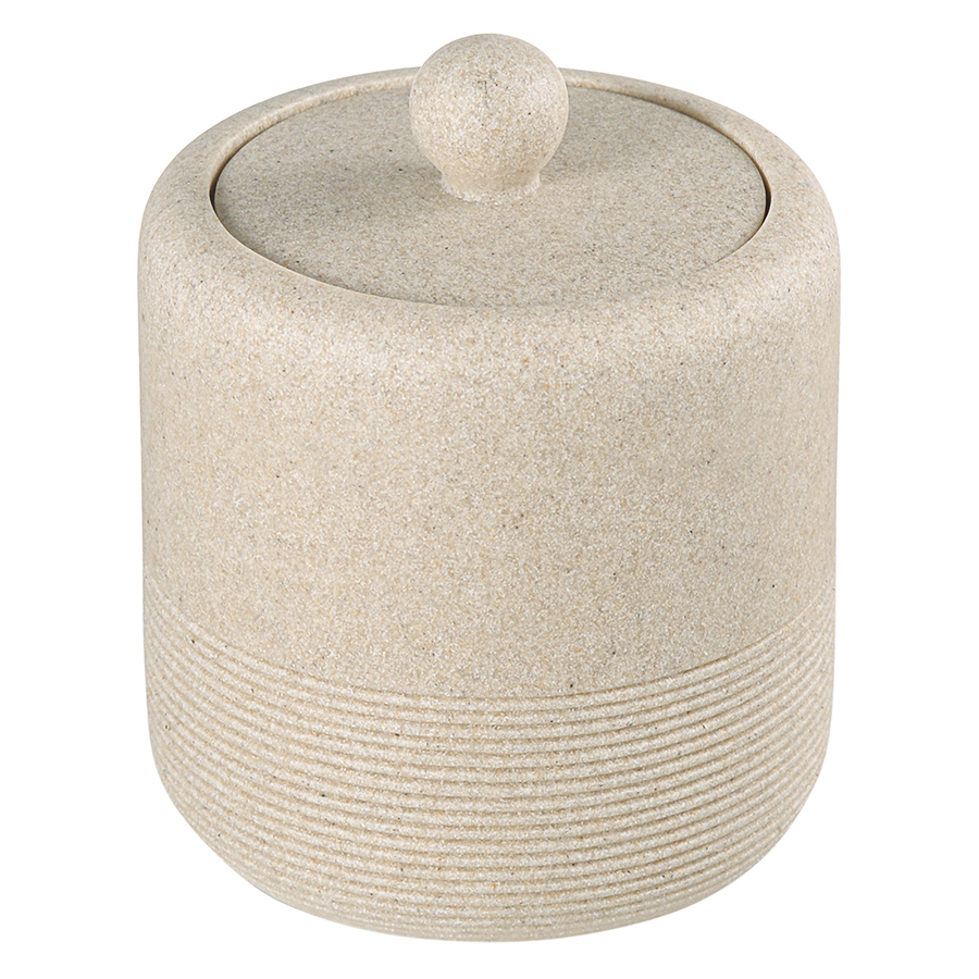 Банка для хранения Loup имеет корпус и крышку из полирезина, стилизованного под натуральный камень бежевого оттенка. Материал легко моется, отличается устойчивостью к влаге, ударам и царапинам, что делает его идеальным выбором для ванной комнаты. Емкость компактных размеров занимает минимум места на полке или в шкафу. В такой банке можно удобно хранить средства гигиены и другие предметы личного пользования.