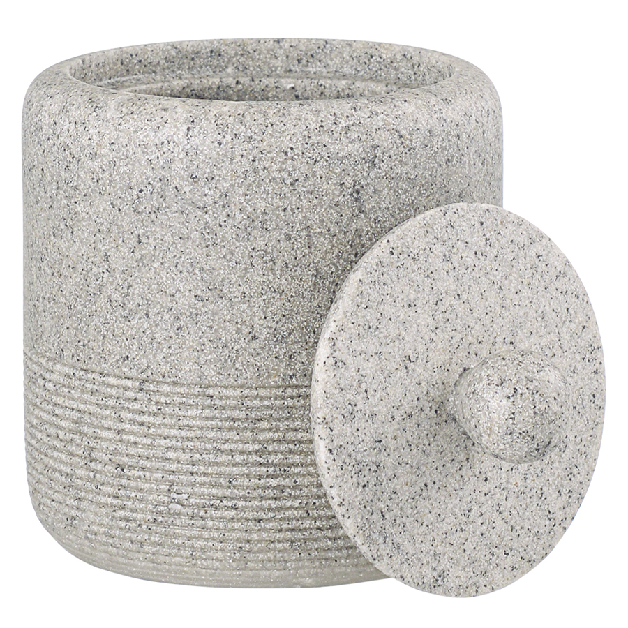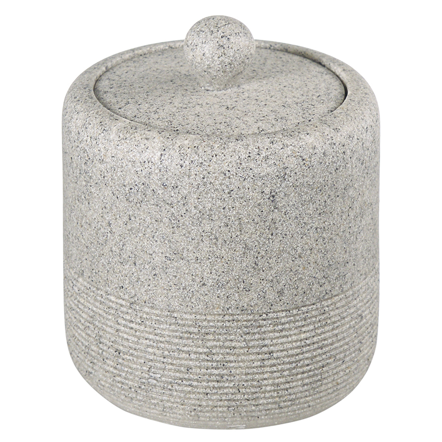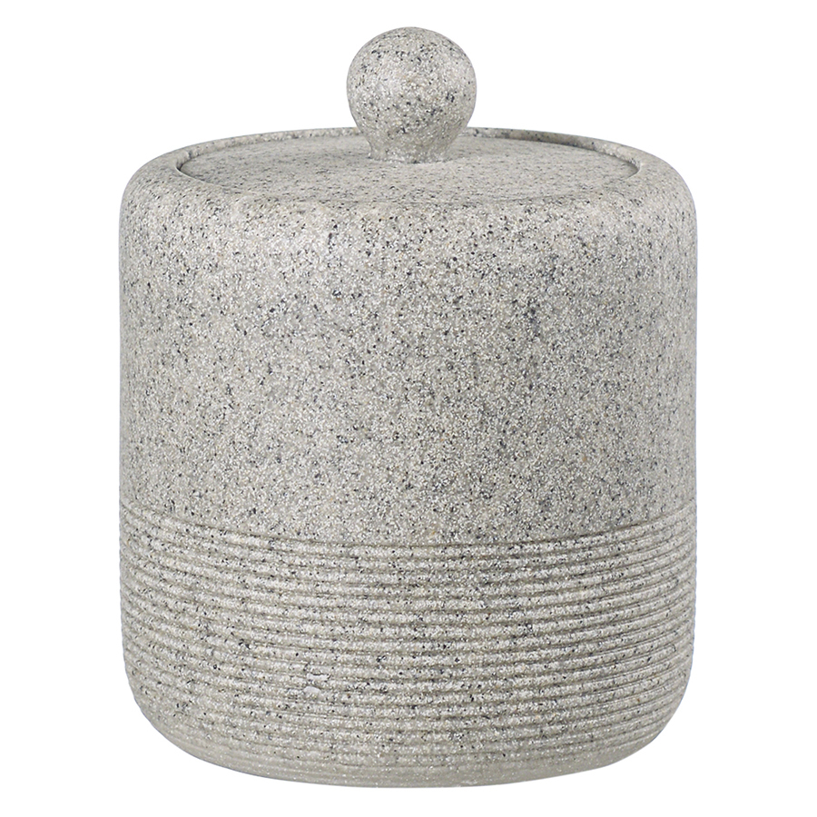 Банка для хранения Loup имеет корпус и крышку из полирезина, стилизованного под натуральный камень темно-серого оттенка. Материал легко моется, отличается устойчивостью к влаге, ударам и царапинам, что делает его идеальным выбором для ванной комнаты. Емкость компактных размеров занимает минимум места на полке или в шкафу. В такой банке можно удобно хранить средства гигиены и другие предметы личного пользования.