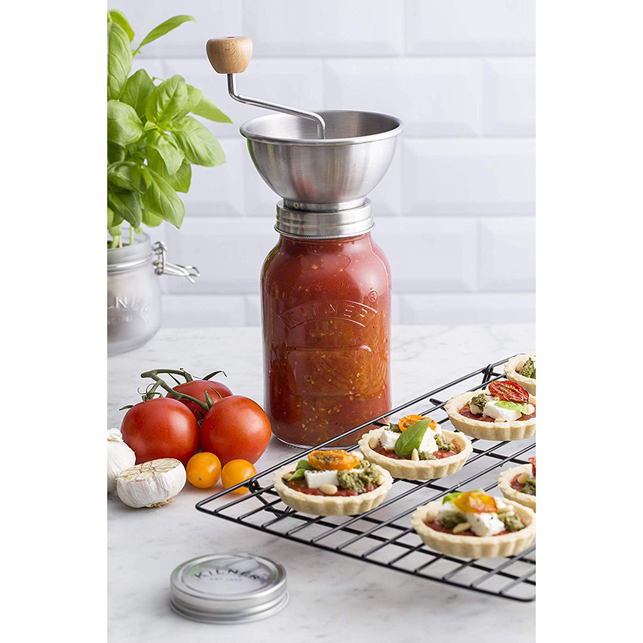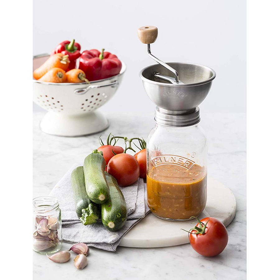 Банка с ручной мельницей Kilner поможет готовить вкусные томатные и яблочные соусы. Изделие станет незаменимым помощником на домашней кухне. Чтобы начать готовку следует установить мельницу на стеклянную банку и заполнить её необходимыми ингредиентами. Для измельчения продуктов в пюре или сок достаточно повернуть ручку. , ,Мельница выполнена из нержавеющей стали, которая отличается прочностью и стойкостью к пищевым кислотам. В комплект также входит крышка для банки, поэтому свежее пюре можно легко хранить в холодильнике. Производитель рекомендует избегать использования абразивных губок при мытье посуды.