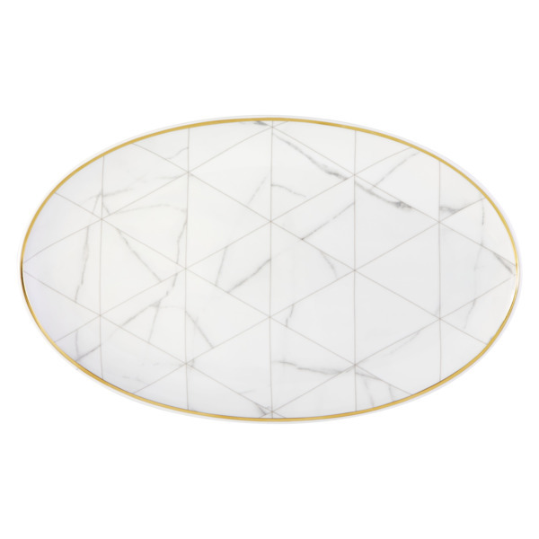 Контрастный дизайн сочетает геометричный орнамент с плавными узорами каррарского мрамора. У каждого предмета - свой особый рисунок. Посуда изготовлена из практичного фарфора, который вручную декорирован золотым кантом.