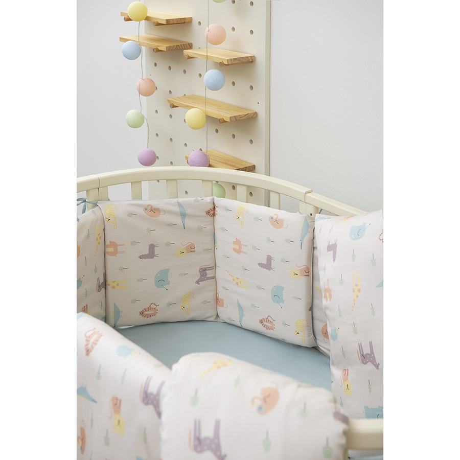 Бортик в кроватку из сатина с принтом Animalia world из коллекции Tiny world сделает первую кроватку малыша особенно уютной и безопасной: защитит от случайного сквозняка, немного приглушит внешние звуки и свет, прикроет жесткое ограждение кроватки. Принт нанесен на обе стороны бортика. Изделие подойдет для обычной и для круглой кроватки-трансформера, состоит из 6 секций по 2 «подушечки» и крепится к кроватке прочными завязками. Бортики будут сочетаться с любым постельным бельем.