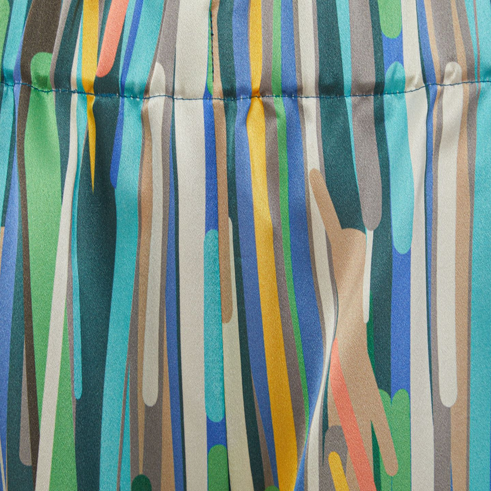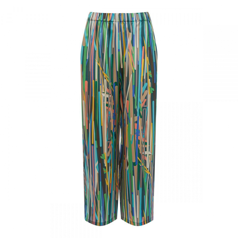 Натуральный шелк сорта Mulberry с плотностью 22 момми отличается мягкостью, прочностью и красивой драпировкой. Многоцветный узор в полоску делает брюки яркой деталью гардероба и позволяет легко сочетать их как с базовыми вещами, так и с более выразительными элементами образа.