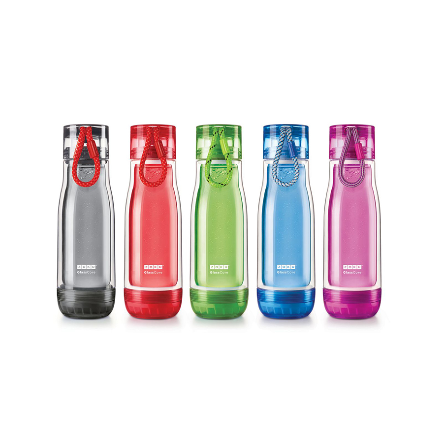 Компактная бутылка Zoku идеально подойдет для тех, кто регулярно занимается спортом и любит активный образ жизни. Бутылка выполнена из боросиликатного стекла и заключена в пластиковый корпус, укрепленный с двух сторон силиконовыми ударопрочными подкладками. Крышка полностью герметична, оснащена прочным и гибким шнурком для переноски и закрывается при повороте всего на 90° благодаря запатентованной технологии Rapid Lock™. Защитная конструкция с двойными стенками помогает избежать конденсации и поддерживает температуру напитка в течение долгого времени. Бутылка совмещает в себе все преимущества стекла и пластика - она не накапливает запахи, ее легко мыть и удобно брать с собой.