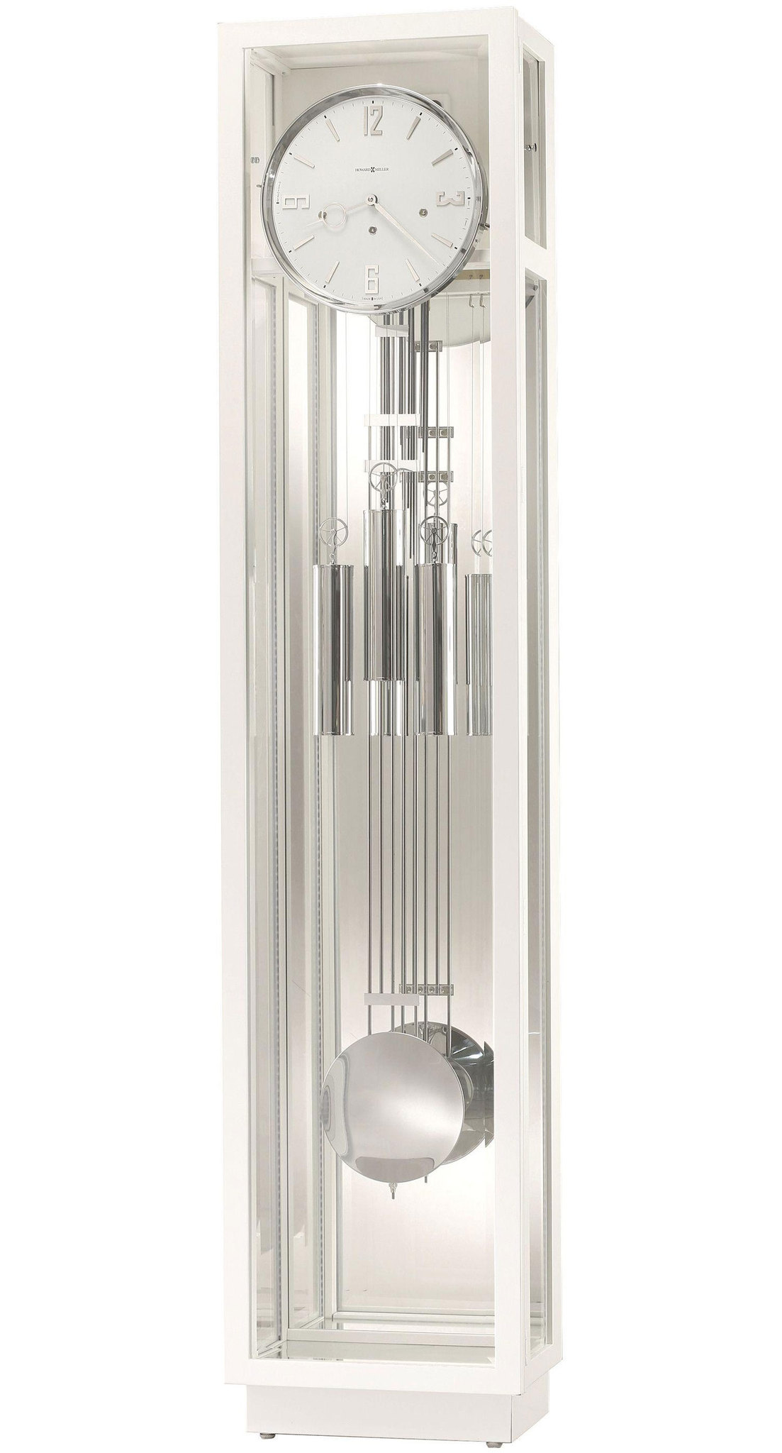 Декоративные гири и решетчатый маятник отделаны полированным хромом и дополняют линейный образ этих часов.
