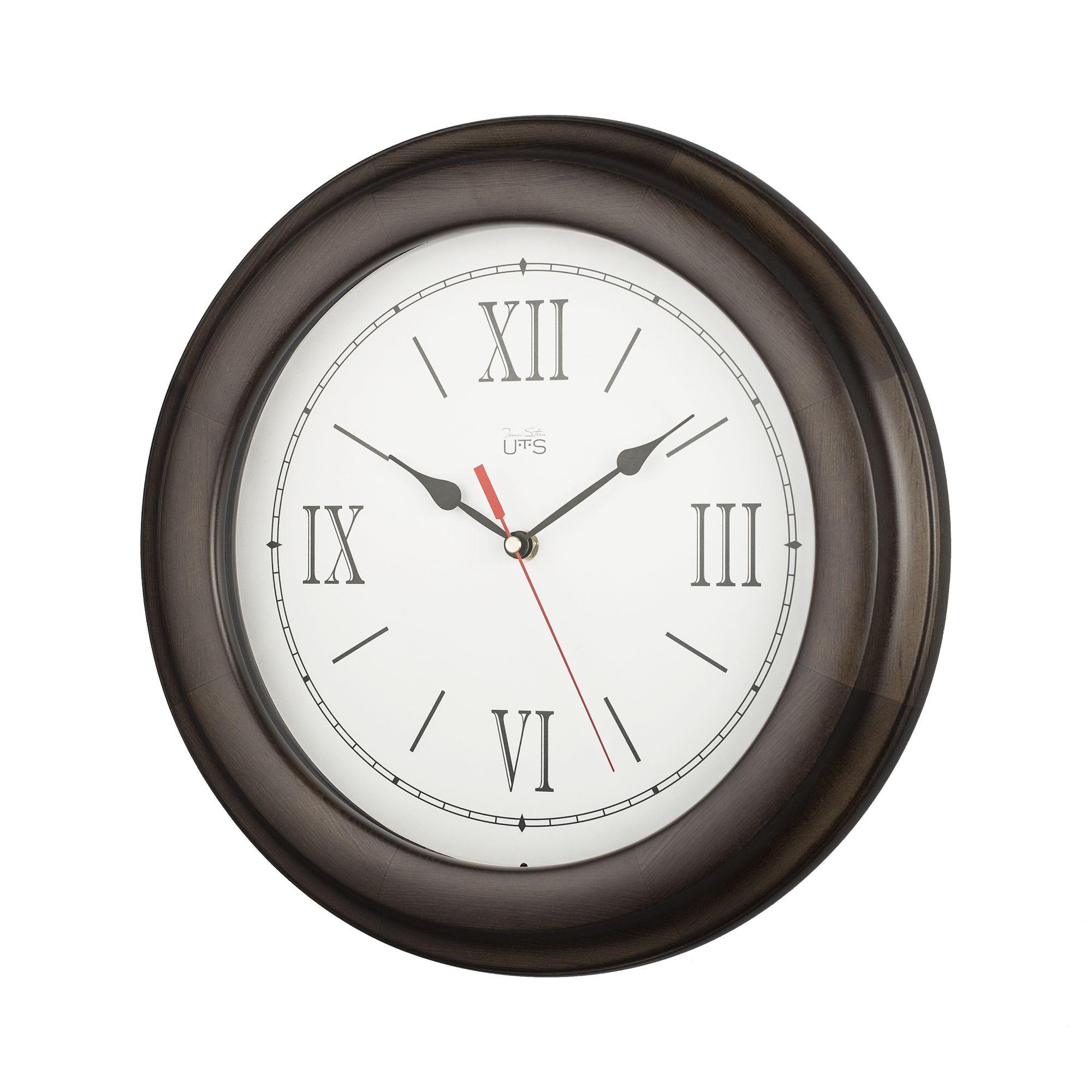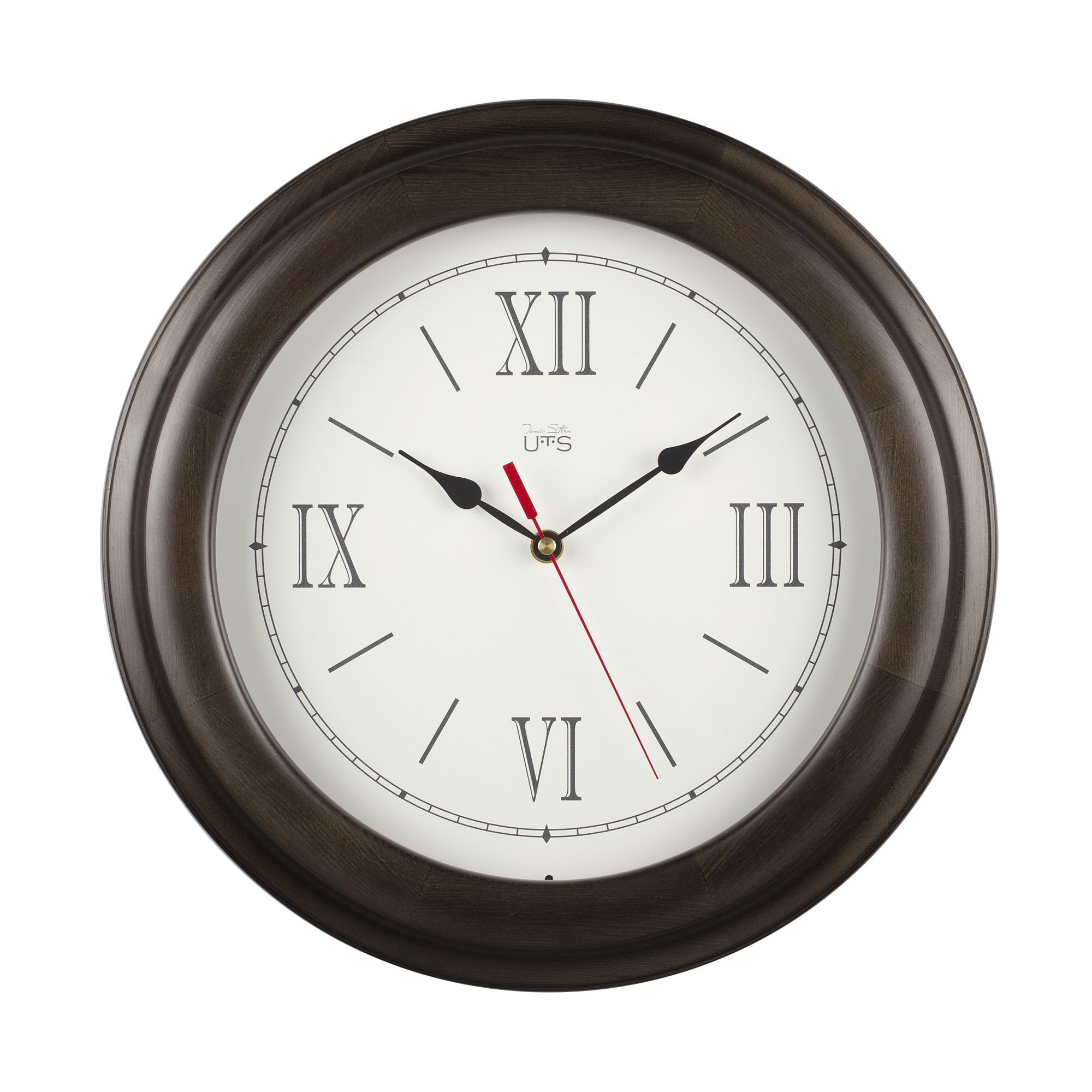 Кварцевые настенные часы. Обод часов выполнен из массива сосны и тонирован в темно-коричневом цвете. Белый циферблат размечен элегантными римскими цифрами и часовыми индексами черного цвета. Дополняют циферблат изящные черные стрелки пикообразной формы и контрастная красная секундная стрелка. Циферблат и стрелки закрыты стеклом. В часах установлен абсолютно бесшумный, точный и надежный механизм Young Town 12888 c плавным ходом. Необходим 1 элемент питания типа АА (в комплект не входит).