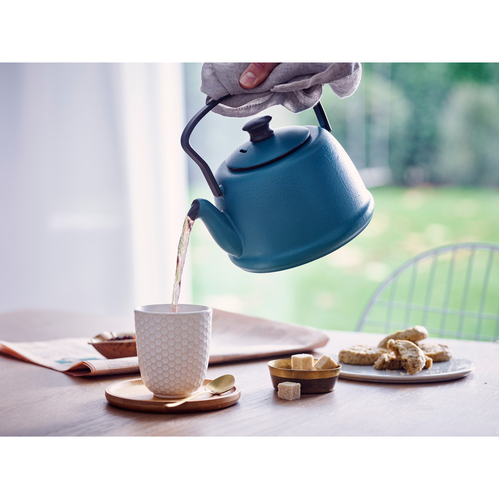 Изделие имеет мелкоячеистое ситечко из нержавеющей стали: можно заваривать мелколистовые сорта чая. Ситечко имеет достаточно большой объем для свободной циркуляции в нем чайных листьев, что гарантирует быстрое качественное заваривание и превосходный вкус напитка. Продуманная форма носика предотвращает проливание. Прочный долговечный чугун отлично проводит и долго сохраняет тепло. Благодаря широкому основанию чайник можно использовать на любых типах варочных поверхностей, включая индукционные. Это позволяет нагревать воду на низкой или средней температуре, а затем добавлять чай. Легкий аромат свежезаваренного чая распространяется через небольшое паровыпускное отверстие в крышке. Складывающаяся ручка обеспечивает опрятное и компактное хранение.