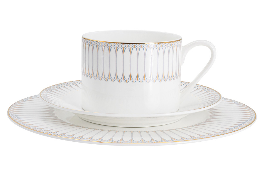 6 чашек 0,22 л, 6 блюдец 15,5 см, 6 тарелок 21 см, 1 чайник 0,75 л, 1 сахарница 0,25 л, 1 молочник 0,28 л