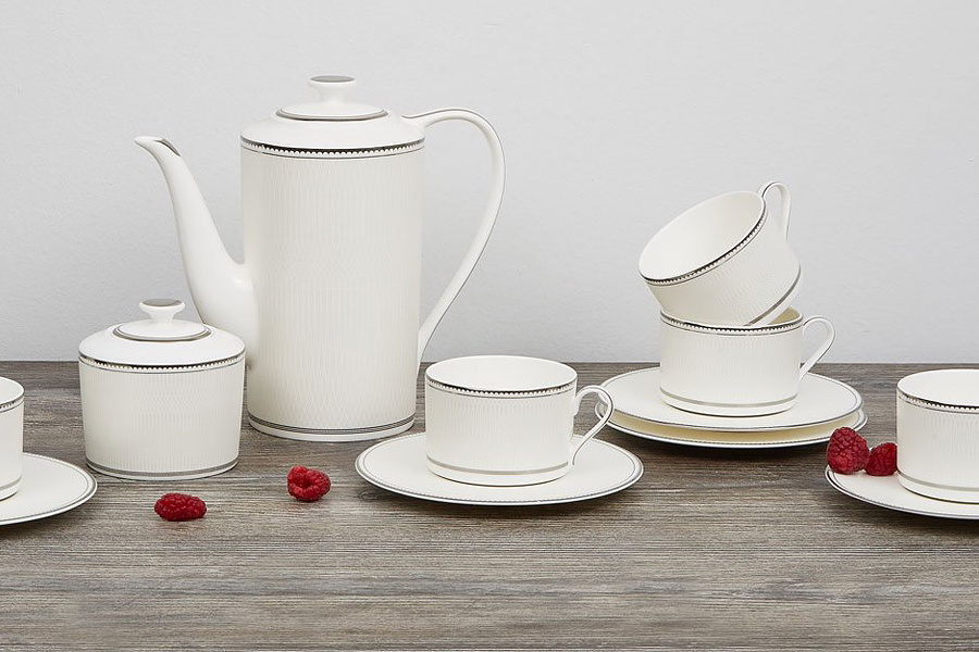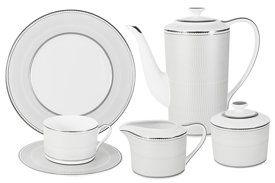 6 чашек 0,25 л, 6 блюдец 17 см, 6 закусочных тарелок 21,5 см, чайник 1,4 л, сахарница 0,35 л, молочник 0,25л