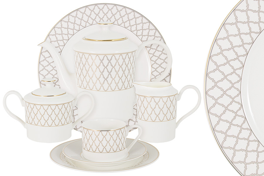 12 чашек 0.22 л; 12 блюдец 16 см; 12 тарелок 21 см; чайник 1.25 л; сахарница 0.48 л; молочник 0.38 л; блюдо для торта 27 см