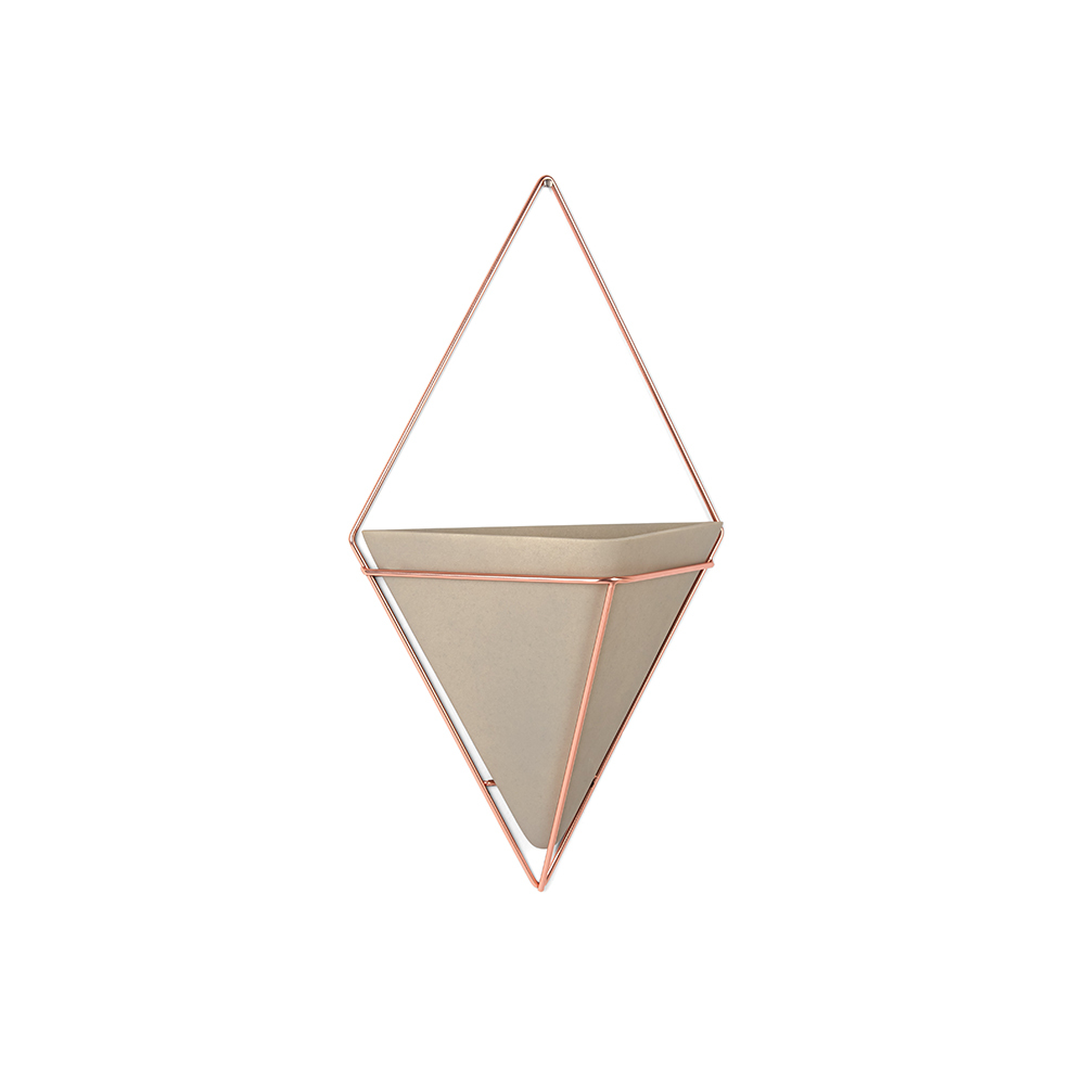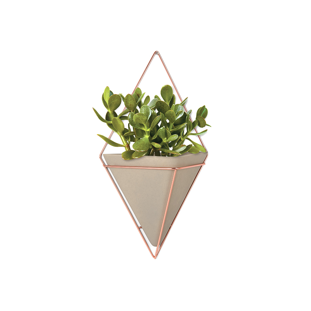Стильный и функциональный настенный декор со строгими геометрическими формами. Представляет собой треугольное кашпо из бетона в , ,медном ромбовидном обрамлении. Может быть использован для выращивания цветов или как подставка для мелочей. Крепится к стене или к вешалке. Две или более вазы могут формировать геометрические узорные композиции.