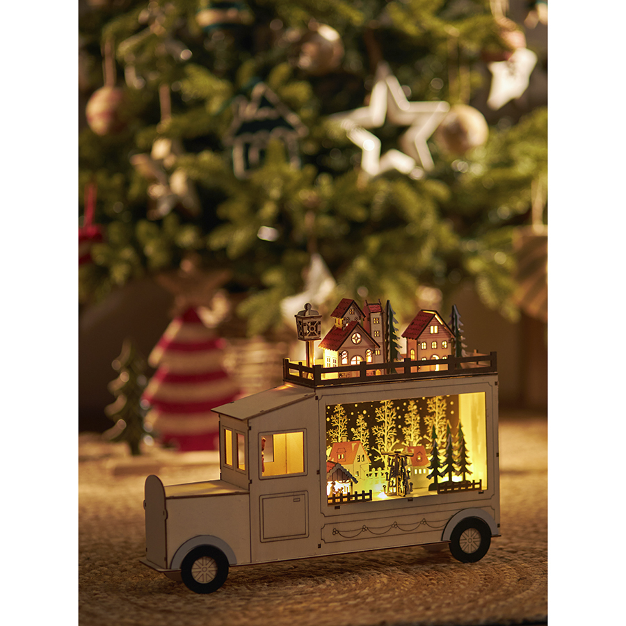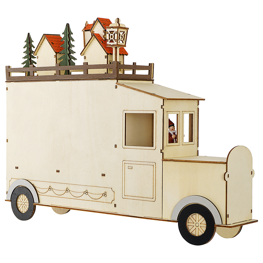 Декор изготовлен в форме грузовика, украшенного новогодней аппликацией. Милый и трогательный образ эффектно подчеркивает специальная подсветка, которая добавляет украшению особый шарм и создает праздничную атмосферу. Долгими зимними вечерами Festive truck будет согревать ваш дом уютными огоньками и поможет поверить в чудеса. Изделие выполнено из фанеры, что обеспечивает ему прочность и долговечность. Для работы требуются 2 батарейки типа АА, которые не входят в комплект.