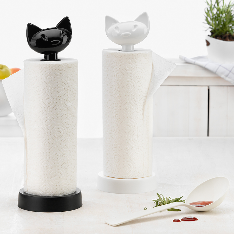 Держатель для полотенец с мордочкой кошки удачно впишется в пространство кухни, имеет устойчивое основание, которое при этом не займёт много места на кухне.