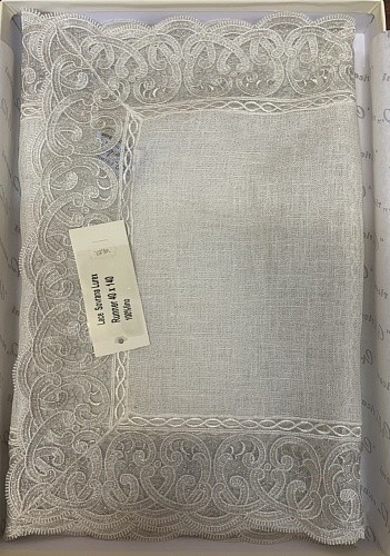 Изящная дорожка для сервировки стола, расшитая флорентийским кружевом. Состав: 100% лен.