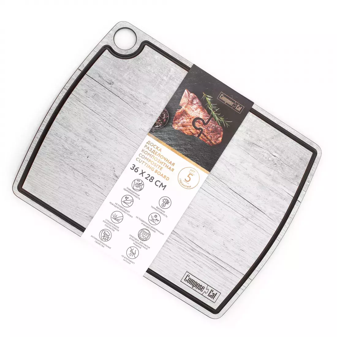 Отдельного внимания заслуживает покрытие разделочных досок от Compose Eat. От агрессивного воздействия остро заточенного лезвия кухонного ножа их защищает особый материал, обладающий повышенной степенью прочности и умеренной упругости. В результате вы можете целый день использовать любую из представленных в этом разделе моделей, и она при этом сохранит свой внешний вид и красоту.