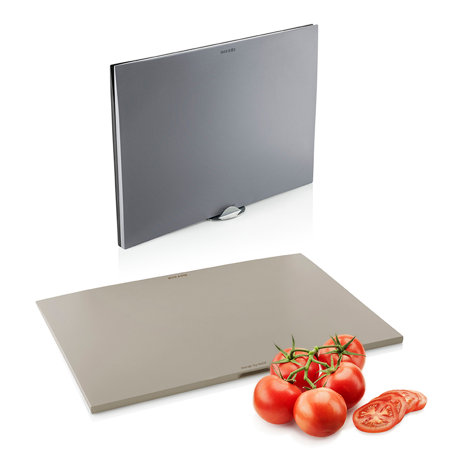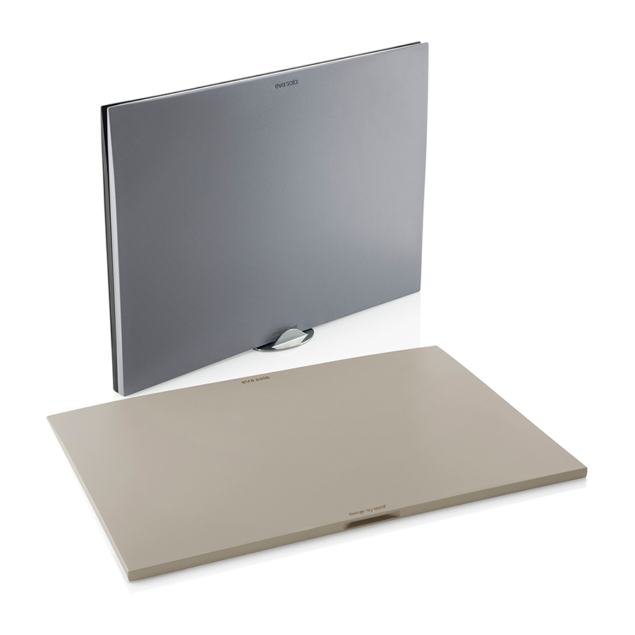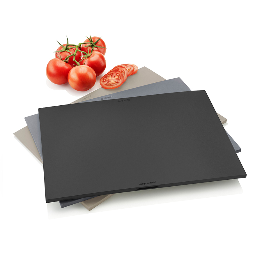 Набор состоит из трёх досок - каждая имеет свой оттенок, а также подставки для удобного хранения. Благодаря оттенкам доски могут быть использованы каждая для своей цели, например, отдельно для хлеба, овощей или рыбы, мяса и птицы. Благодаря удобному уголку в конструкции доски её удобно брать. Также доски для разных продуктов удобно сушить отдельно друг от друга. Можно мыть в посудомоечной машине при температуре не выше 65 градусов.