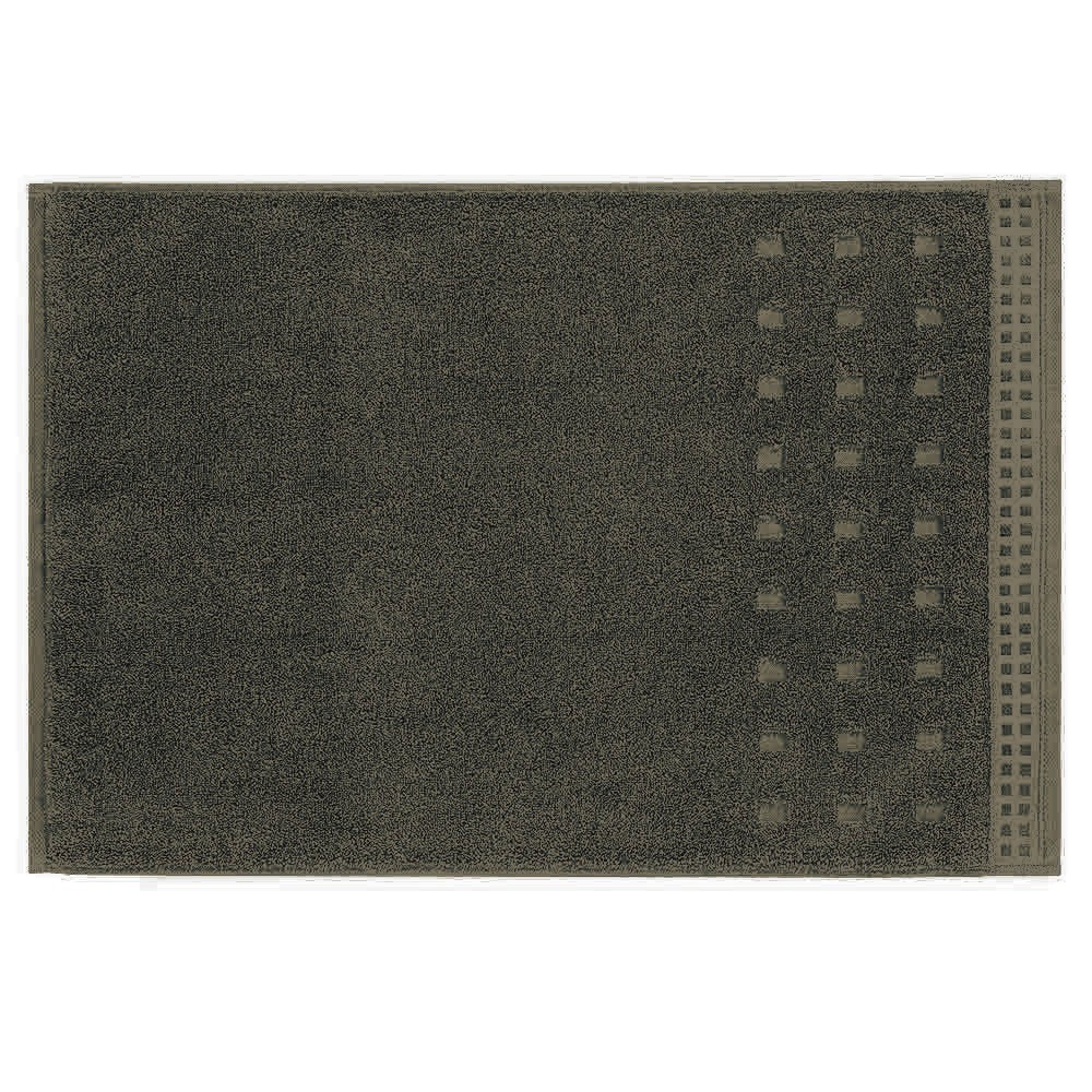 Полотенце тёмно-зелёного цвета с рисунком в виде квадратиков, такие же квадратики на бордюре полотенца, это придает им современную элегантность. Изготовлено из натурального органического хлопка.
