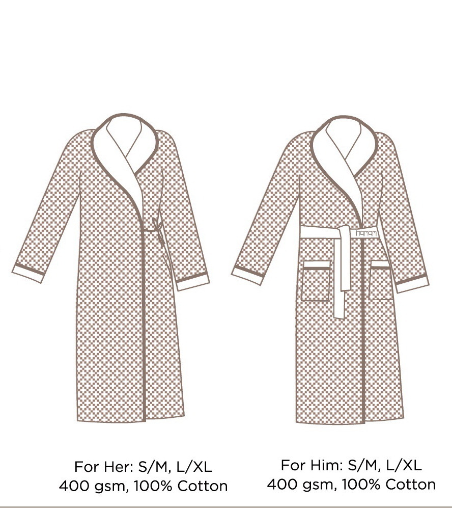 Халат средней длины кремового цвета с контрастной отделкой коричневого цвета выполнен из натурального хлопка.