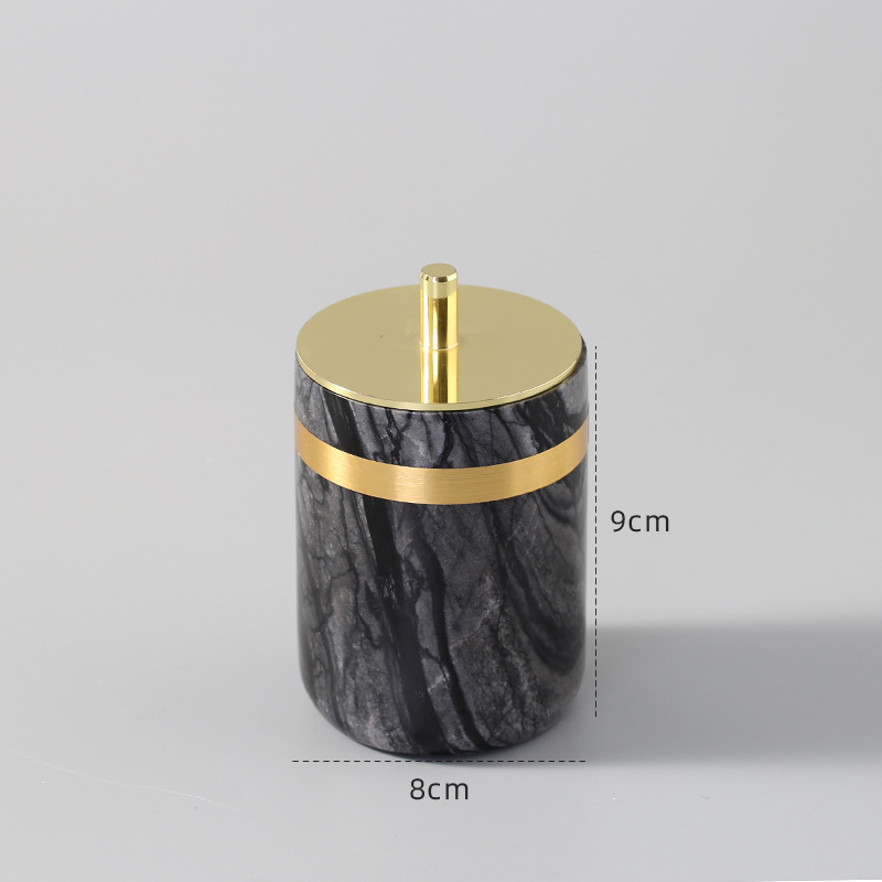 Изысканная косметическая емкость изготовлена из натурального мрамора. Каждое изделие вырезано вручную из отдельных блоков, что делает его оригинальным и неповторимым по рисунку. Изящная вставка из золотого металла добавляет роскоши.