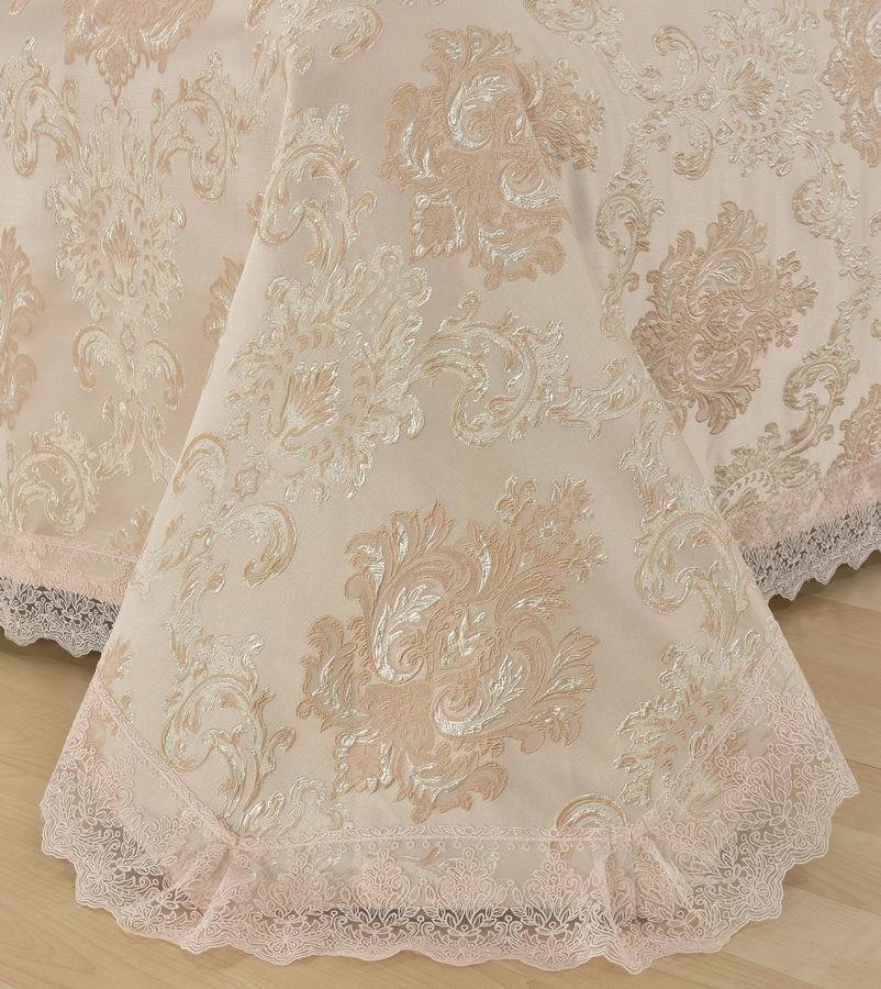 Покрывало Эванжелина Состав: 100% вискоза; Комплектация: Покрывало: 240х260 (1); Наволочки: 50х70 (2шт); Особенности: декоративный жаккардовый узор, Декоративное кружево Упаковка: подарочная коробка; Уход : Стирка 30с°, щадящая сушка.