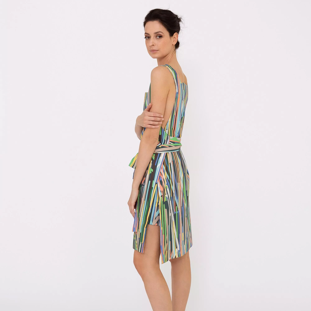 Разноцветный узор в полоску делает фартук ярким текстильным акцентом, который может украсить кухонное пространство и дополнить сервировку. Продуманный крой обеспечивает удобную посадку и свободу движений во время приготовления пищи или творческих занятий.