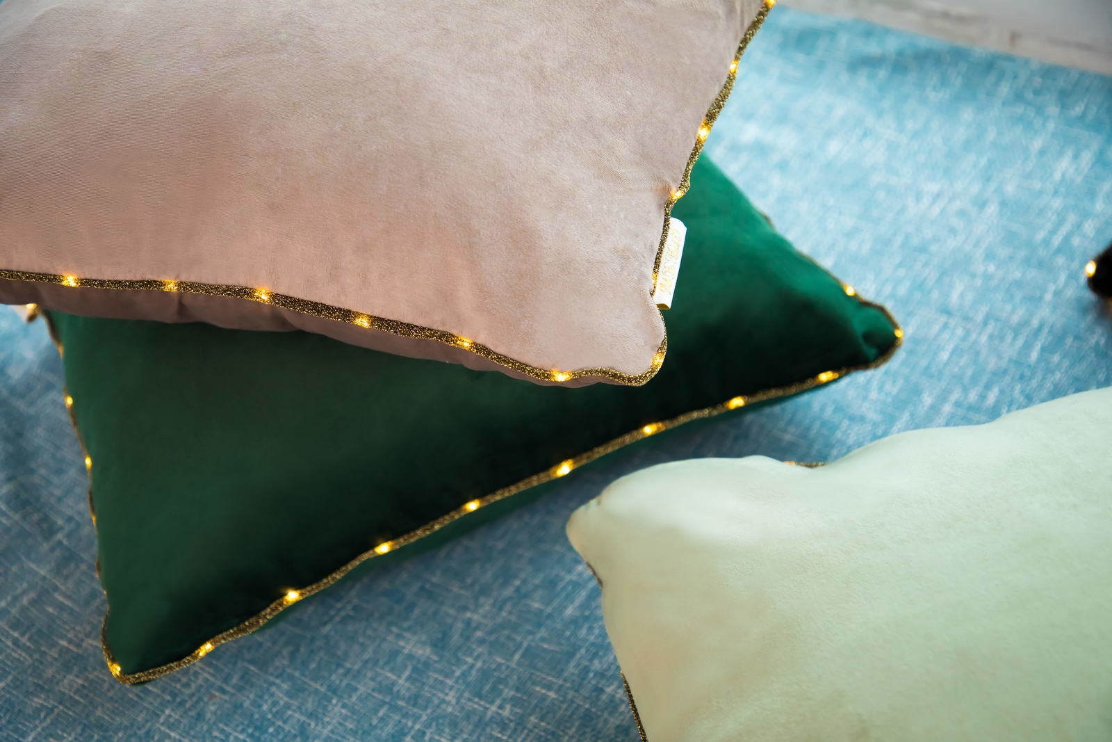 Наволочка декоративная (бархат) Отделка: золотистый кант с встроенной светодиодной подсветкой на батарейке Состав: 100% вискоза
