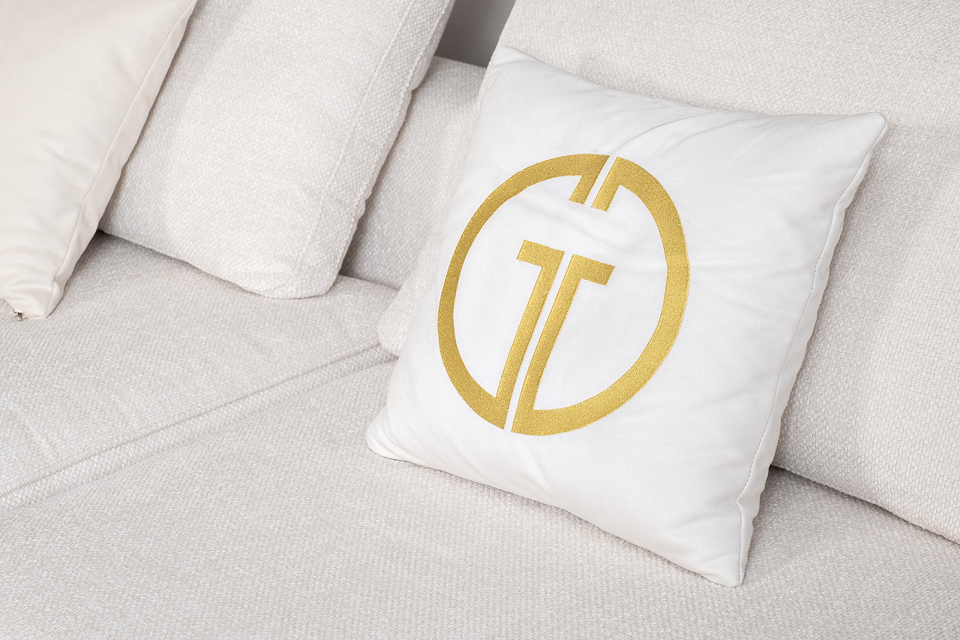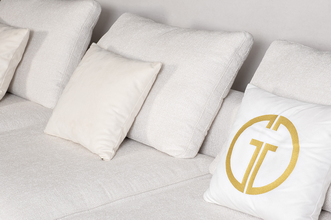 Комплект мебели №1/4 диван Тесоро(Tesoro) модульный. В состав комплекта входит: модуль угловой правый DR+P - 1шт в ткани Моби-Экрю(Mobi-Ecru); модуль прямой DO+P - 1шт в ткани Моби-Экрю(Mobi-Ecru); подушки спинки 5 шт - в ткани Моби-Экрю(Mobi-Ecru); декоративные подушки 45*45см 2 шт в ткани Атмосфера(Atmosphera)010; декоративные подушки 45*45см с вышивкой эмблема - 2шт в ткани Атмосфера(Atmosphera)000; Все модули могут скрепляться между собой в модульный диван , а также использоваться как самостоятельное изделие. Декоративные подушки в стандартный комплект дивана не входят, необходимо заказывать дополнительно. Металлические опоры 180мм- бронза. Габариты модульного дивана: длина - 380см; глубина - 110см,высота- 900см