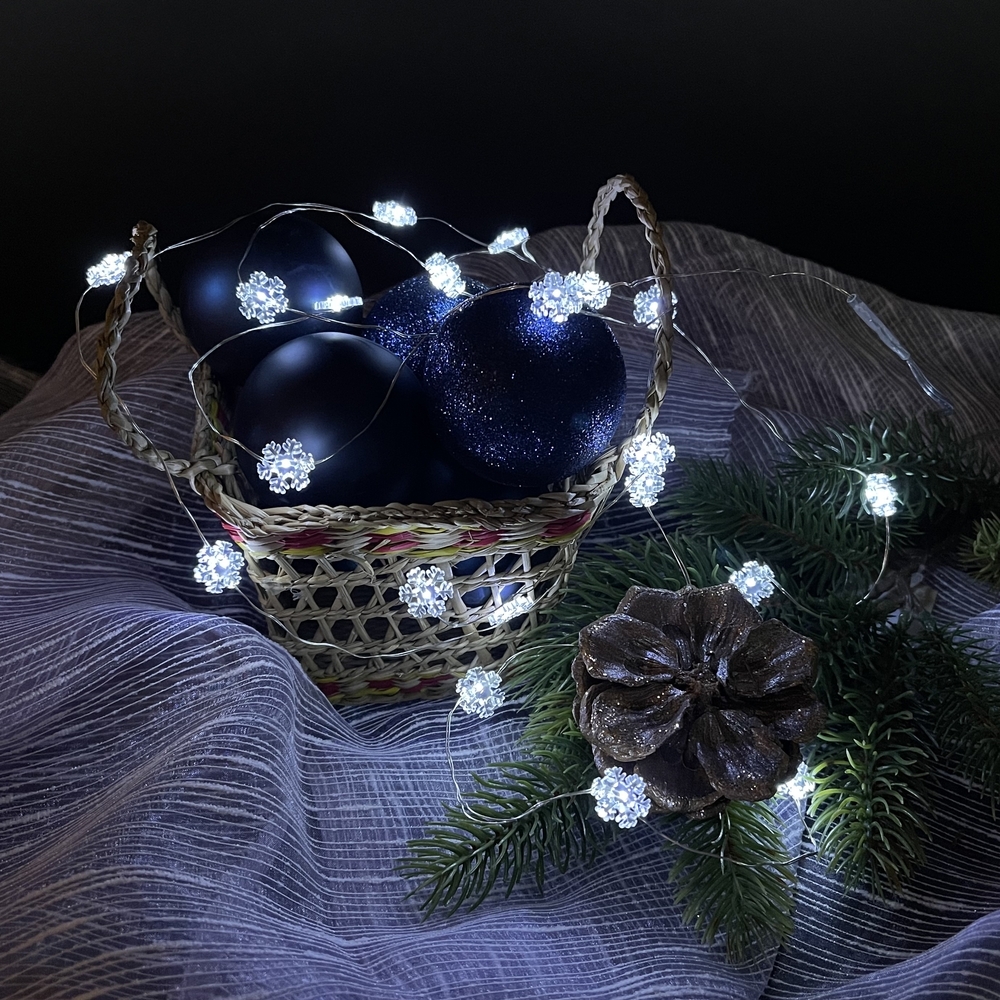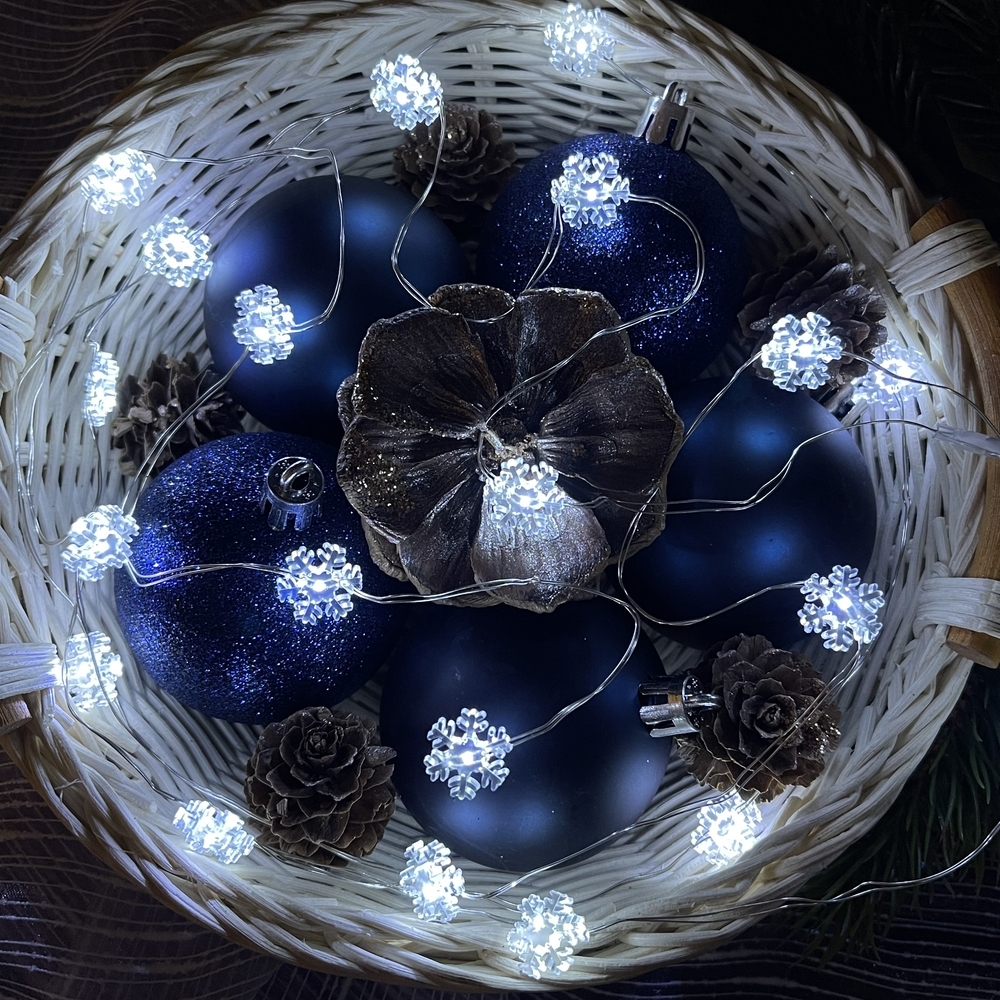 Гирлянда string light на батарейках снежинка на серебряном проводе холодный свет 30 ламп, длина 290 см.