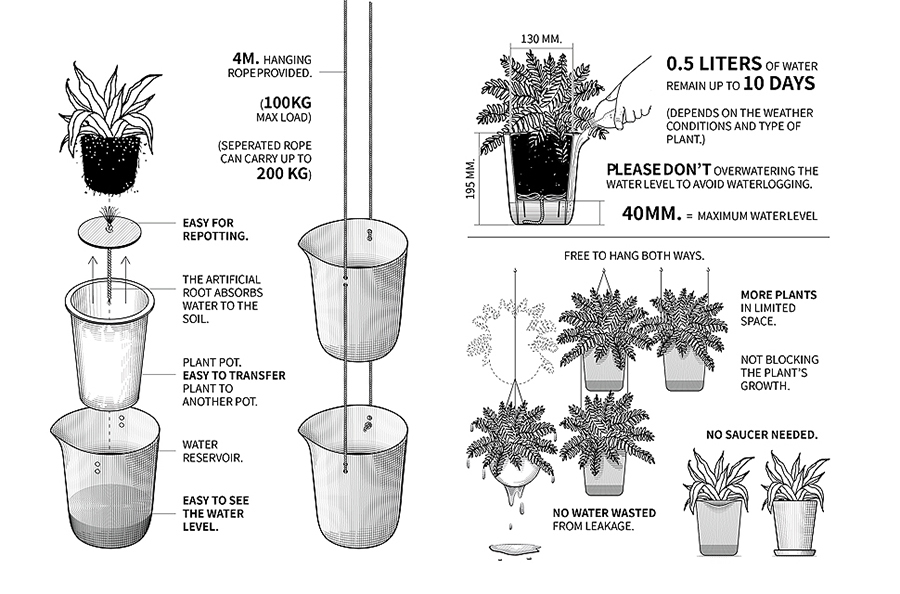Благодаря ее уникальной конструкции комнатные цветы будут самостоятельно увлажняться, достаточно регулярно подливать воду. Горшок можно установить на подоконнике, закрепить на подставке или подвесить на веревке, которая входит в комплект.