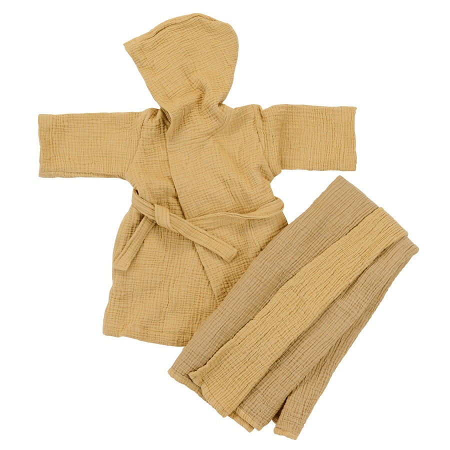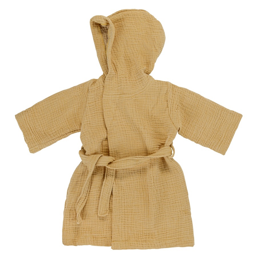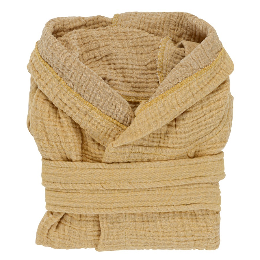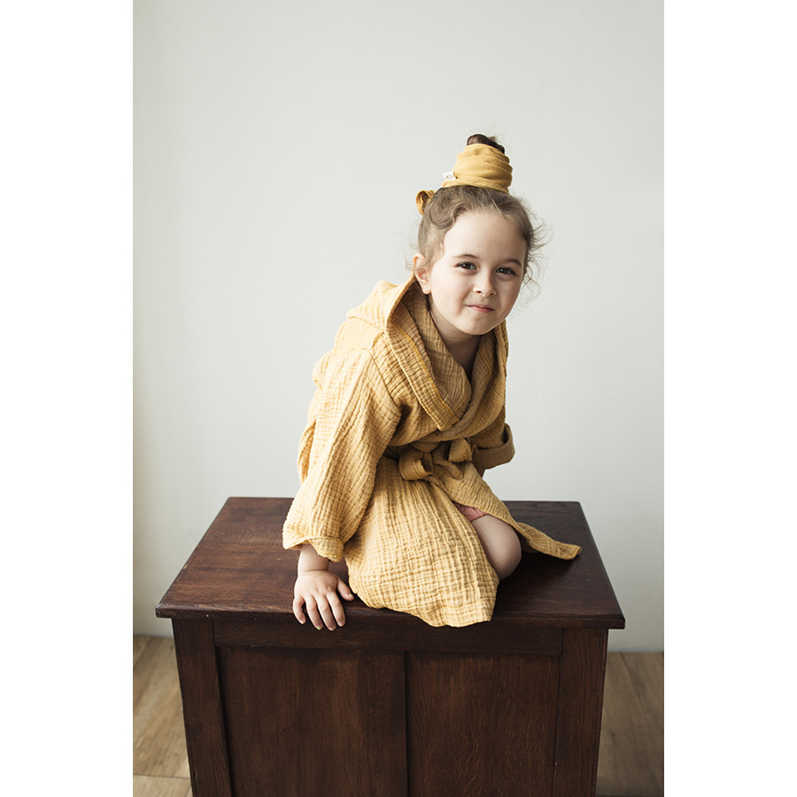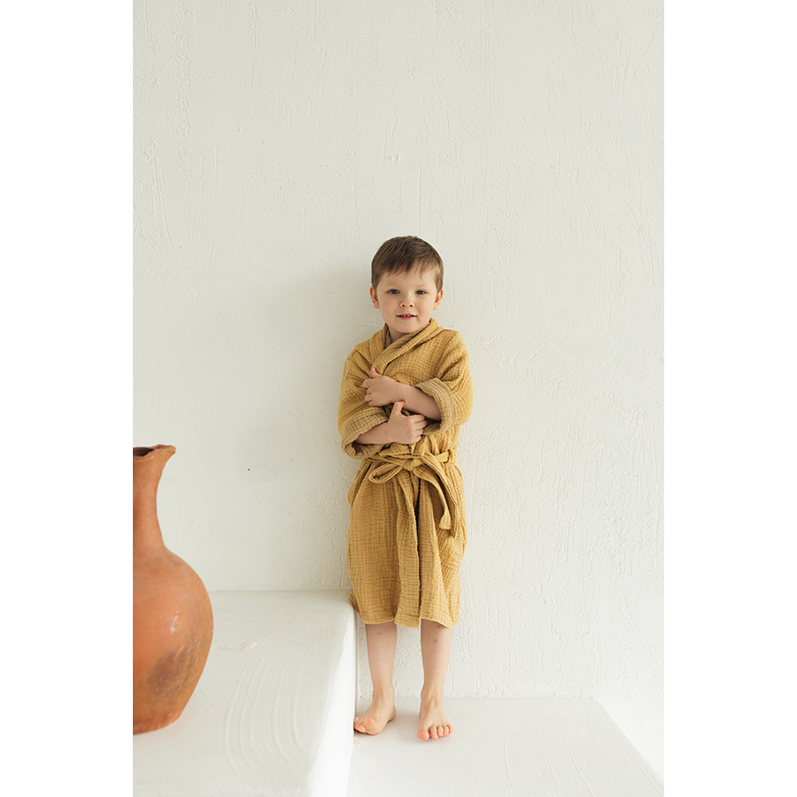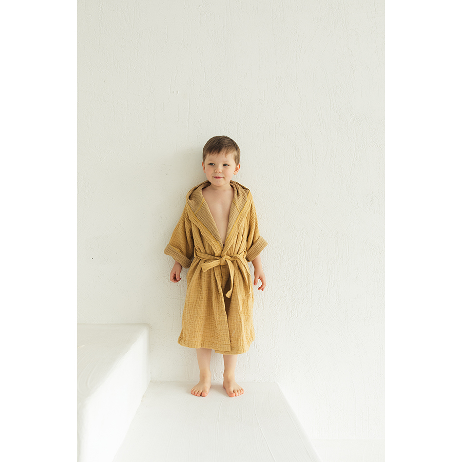 Халат из жатого хлопка горчичного цвета из коллекции Essential лаконичного дизайна и нейтральной расцветки подойдет и мальчику, и девочке. Изделие с капюшоном и с удобным запахом фиксируется на талии широким поясом.