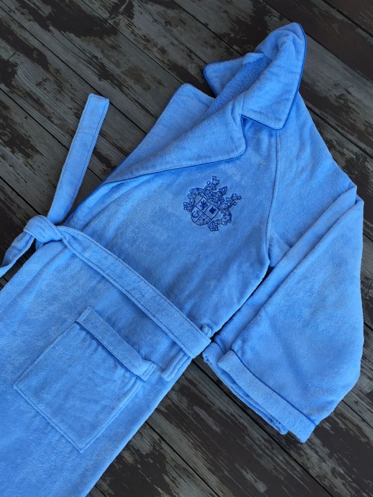 Мужской итальянский халат средней длины из хлопка на поясе, с накладными карманами. Внутренняя сторона халата — махровая, внешняя сторона — велюровая ткань. Роскошная эмблема на левой стороне халата. Карманы, рукава и воротник отделаны богатым атласным кантом.