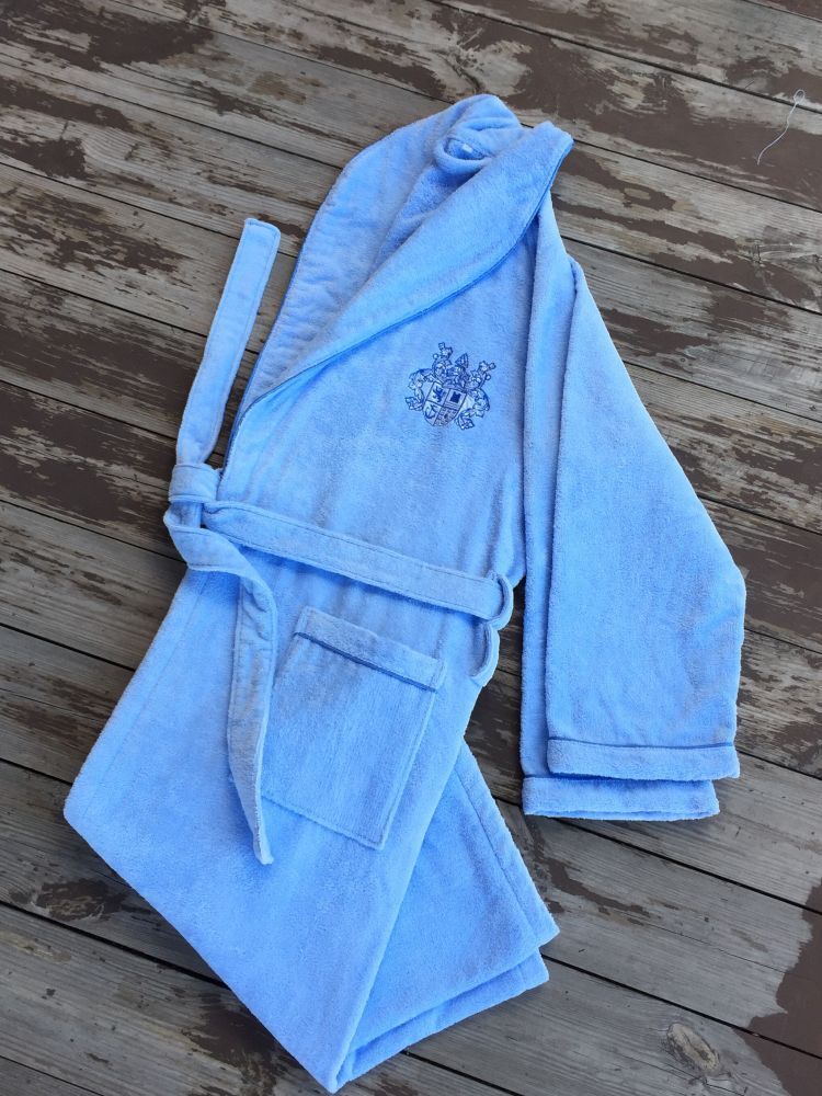 Мужской итальянский халат средней длины из хлопка на поясе, с накладными карманами. Внутренняя сторона халата — махровая, внешняя сторона — велюровая ткань. Роскошная эмблема на левой стороне халата. Карманы, рукава и воротник отделаны богатым атласным кантом.