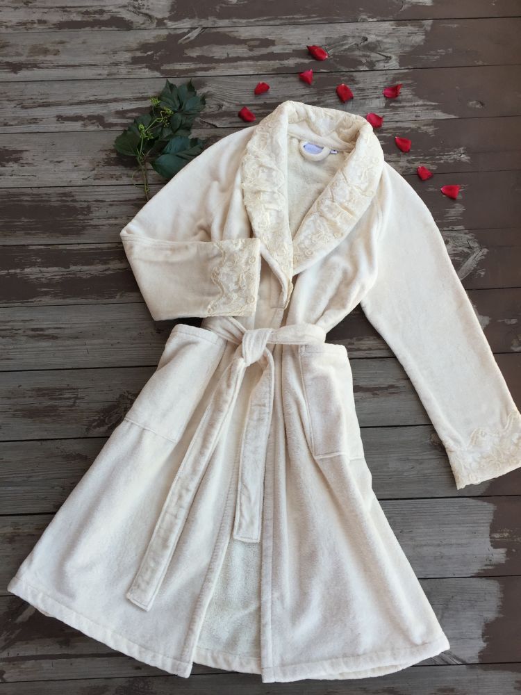 Итальянский женский халат из высококачественного хлопка с отделкой нежным кружевом.