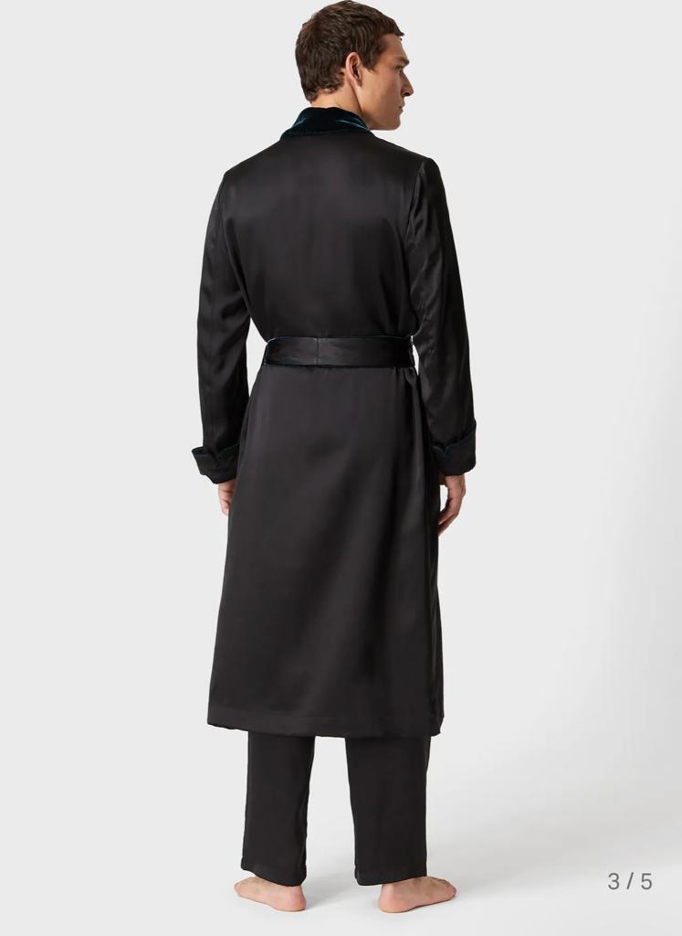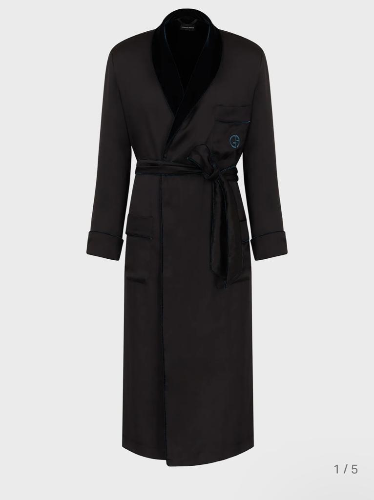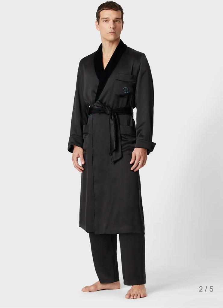 Мастера марки Giorgio Armani сшили халат из тонкого нежного шелка с характерным легким блеском. В двух цветах – универсальный черный с темно-зеленым воротником и синий с бордовым воротником из плотного бархата. Мягкий материал практически не ощущается на теле, обеспечивая комфорт во время отдыха. В комплекте – широкий пояс-лента.