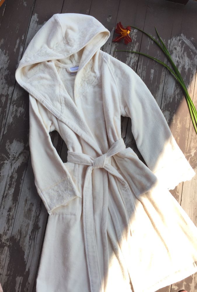 Эта модель классического кроя, сшита из натурального 100% хлопка, с поясом на талии, длинными рукавами, накладными карманами и с кружевной отделкой на капюшоне и рукавах. Халат выглядит очень нарядно. Может использоваться как уютный банный халат и как красивая домашняя одежда. Внешняя сторона халата - велюровая ткань, а внутренняя сторона - нежная мягкая махра, которая дарит приятные тактильные ощущения, мягкость и комфорт после принятия ванны или душа.