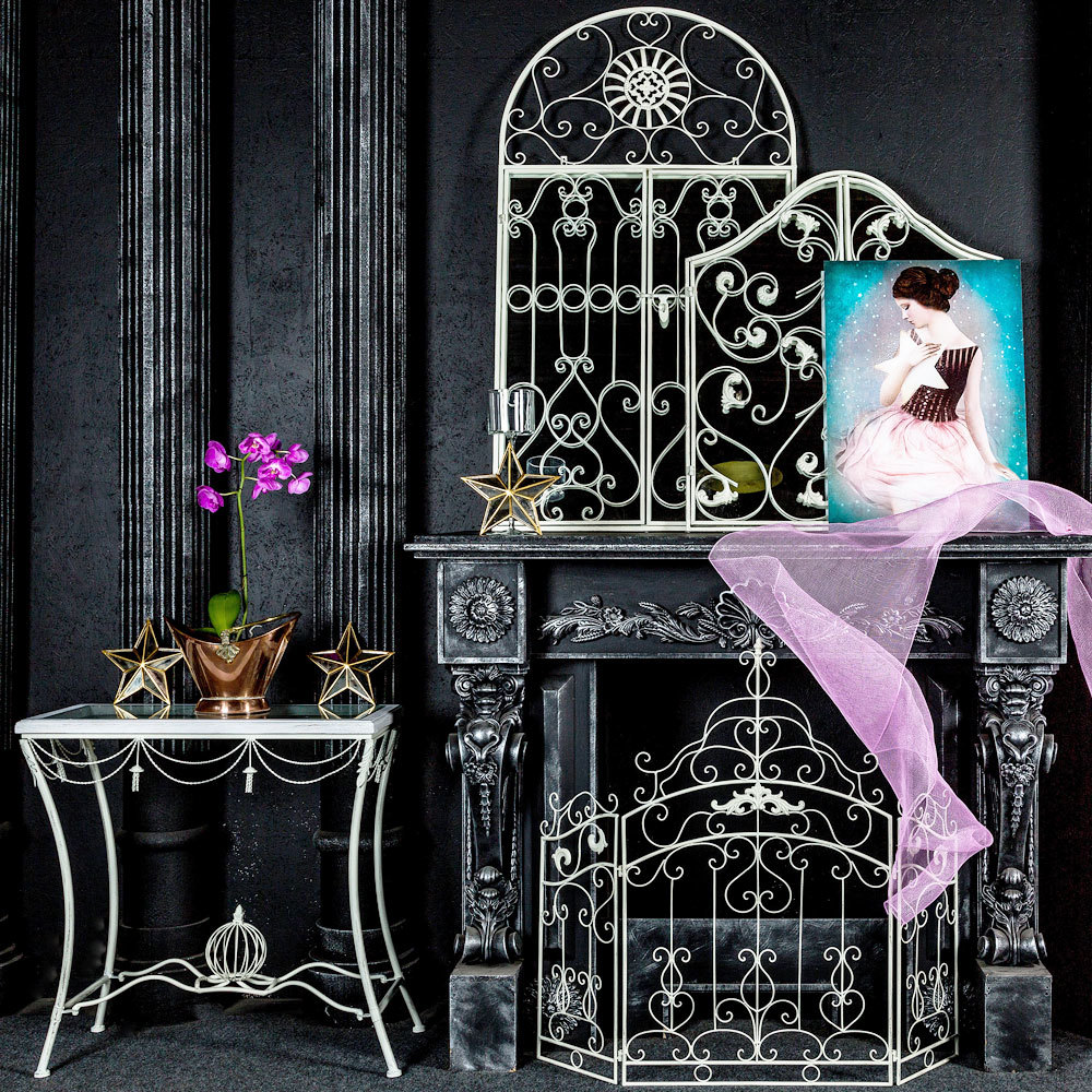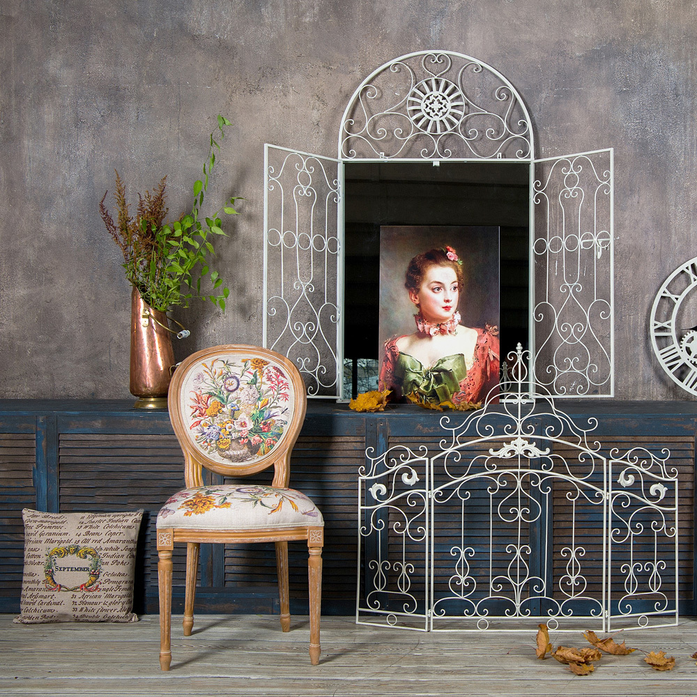 Каминный экран Клермон, избравший имидж роскошных королевских ворот, беспрекословно становится центром интерьерного внимания. Прозрачный кружевной узор режиссирует атмосферу простора и невесомости, свежести и света. Богатый дворцовый орнамент придает интерьеру архитектурную значимость. Классический белый цвет заведомо гармоничен любому нтерьерному фону. Складные экраны практичнее плоских. Трехстворчатая конструкция позволяет моделировать форму, регулируя длину и глубину экрана согласно планировке.