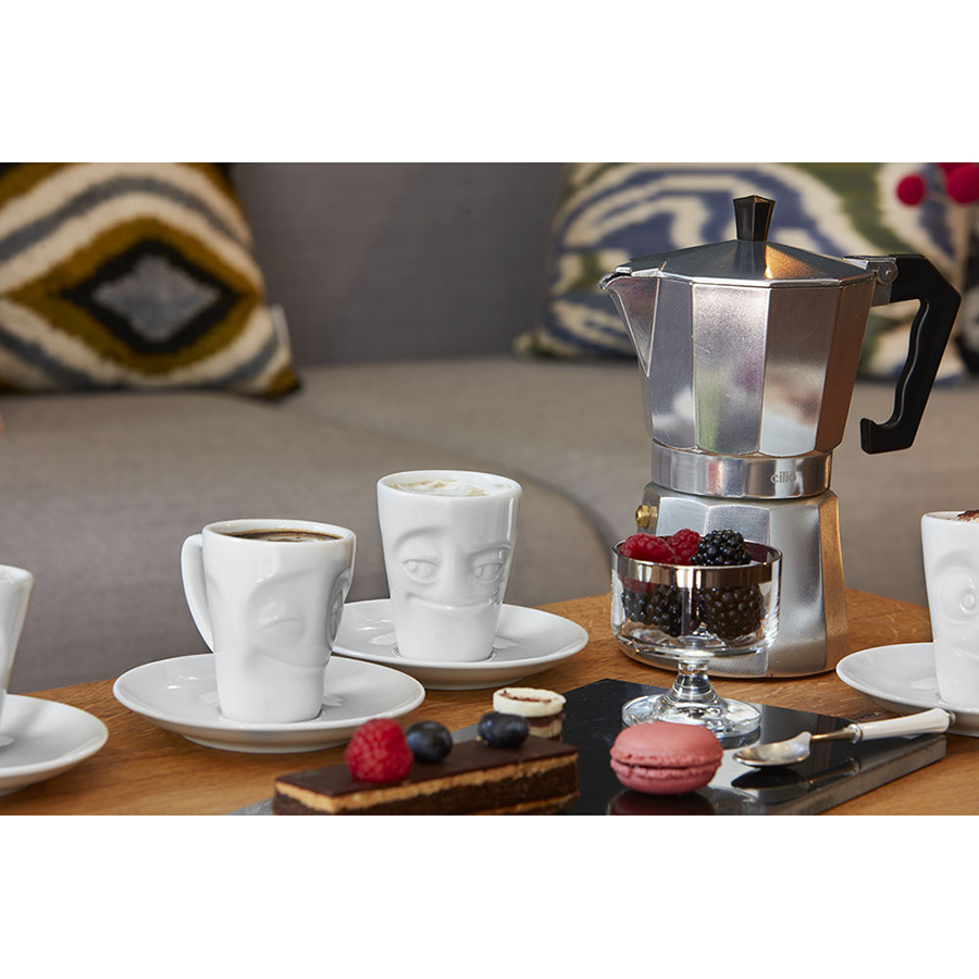 Кофейная пара из оригинальной чашки и блюдца отлично подойдет для подачи эспрессо.
