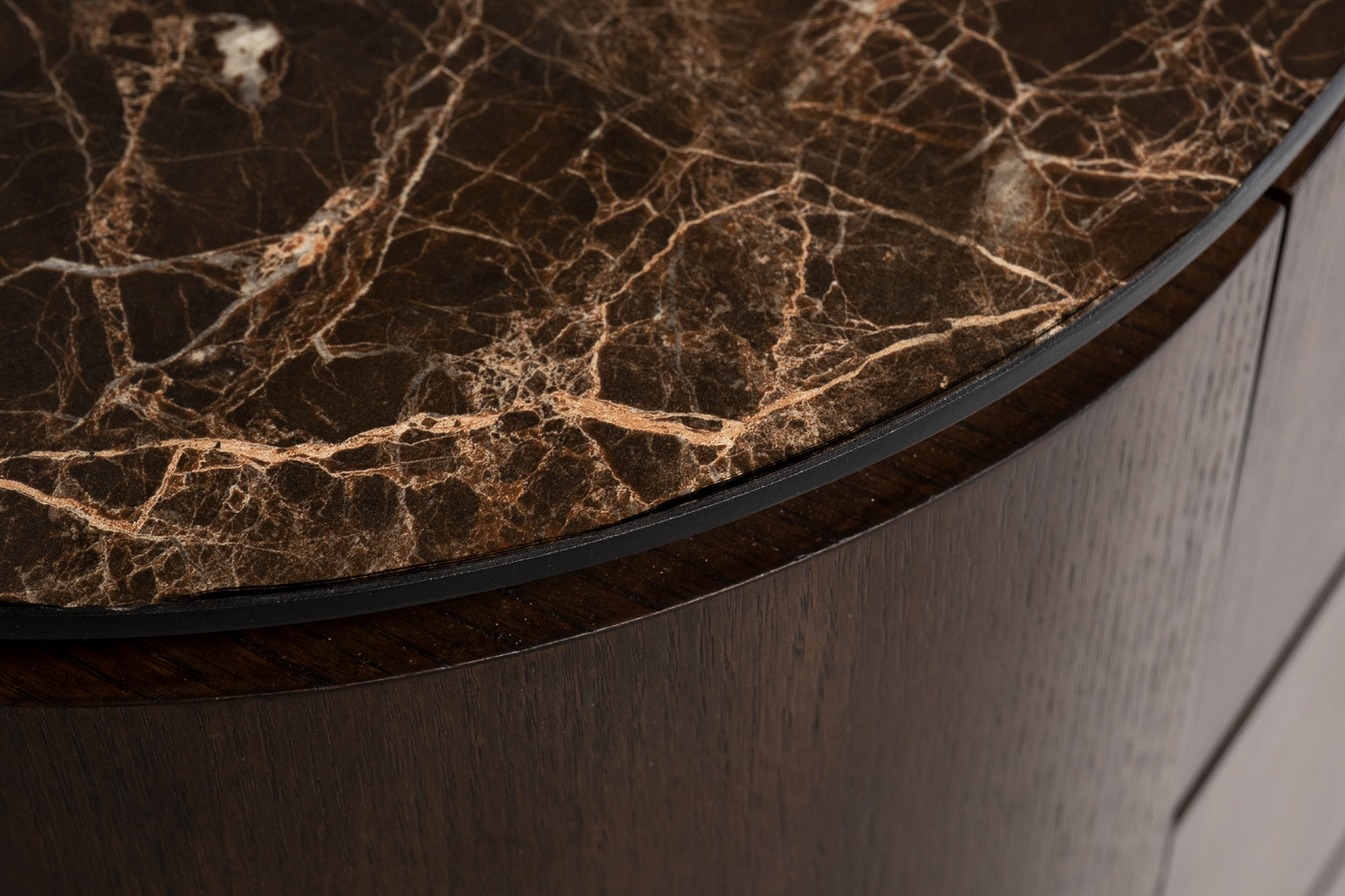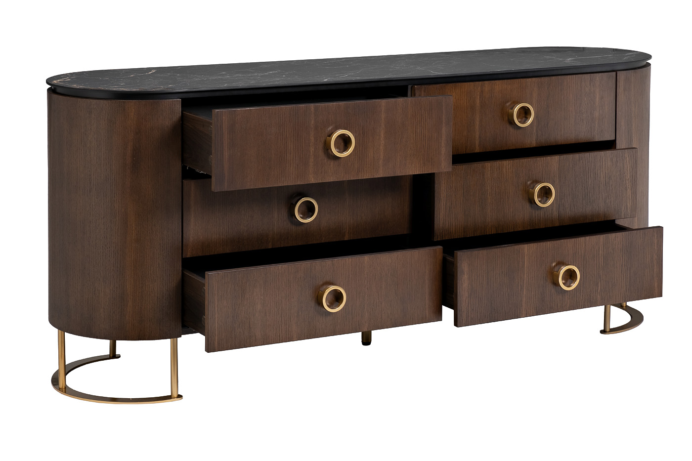 Лаконичный коричневый комод станет эффектным дополнением интерьера гостиной, спальни, кабинета, прихожей. Его фишка – необычная округлая форма, которая добавляет мебели изысканности и шарма. Оригинальные опоры из металла и стильная фурнитура привлекают к себе внимание, но главным декоративным акцентом является столешница из керамогранита. Красивый комод с ящиками легко компонуется с другой мебелью и оптимально подойдет в качестве тумбы под ТВ. Вместительный и практичный, он станет отличным местом для хранения вещей, одежды и текстиля. В фирменных магазинах бренда Garda Decor можно купить комод в спальню, мебель и аксессуары в стиле ар-деко с доставкой.