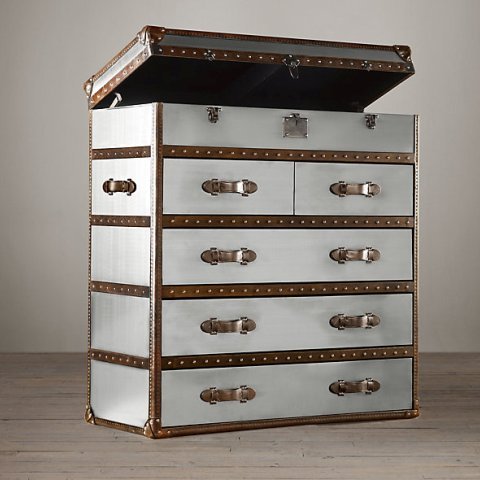 Комод с выдвижными ящиками, выполнен из массива дуба с оббивкой металлом и кожей. Фурнитура выполнена из бронзы.