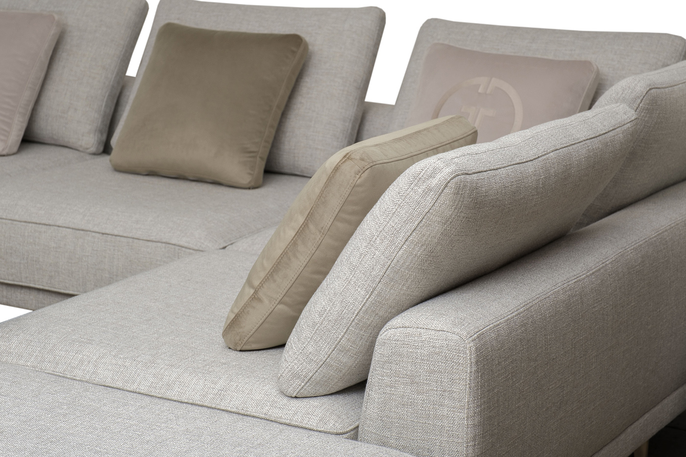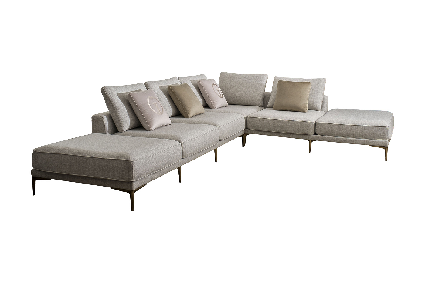 Комплект мебели Тесоро(Tesoro) №49. В состав комплекта входит: модуль угловой левый DL+P- 1шт; модуль прямой DO+P- 1шт.Комплект выполнен в ткани из коллекции Garda Decor- рогожка Нортон-СЕР(Norton-SER). В состав комплекта входят декоративные подушки: декоративная подушка с бурлетом 50*50см-2шт в ткани из коллекции Garda Decor- велюр Колтон(Colton)030 с вышивкой эмблема в цвет ткани, декоративная подушка с бурлетом 50*50см-2шт в ткани из коллекции Garda Decor- велюр Колтон(Colton)1002. Опоры металл- цвет бронза.Габариты комплекта: Габариты модульного дивана: длина - 380см; глубина - 110см,высота- 900см