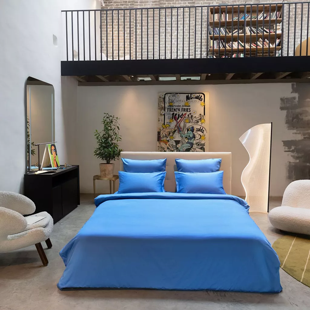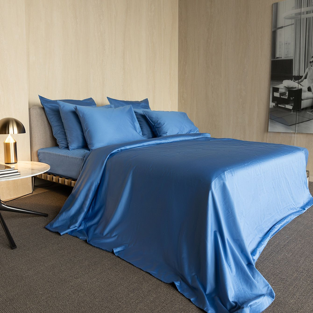 Натуральный хлопок хорошо пропускает воздух, помогает поддерживать комфортную температуру тела во время сна и подходит для ежедневного использования. Насыщенный васильково-синий оттенок добавляет интерьеру спальни выразительный акцент и легко сочетается с различными вариантами оформления спального пространства.