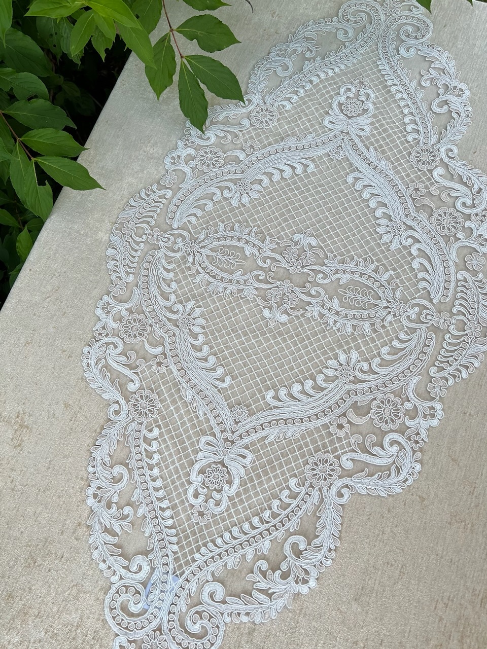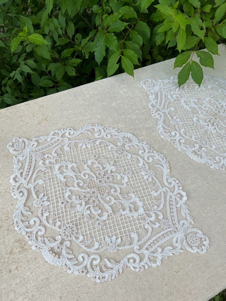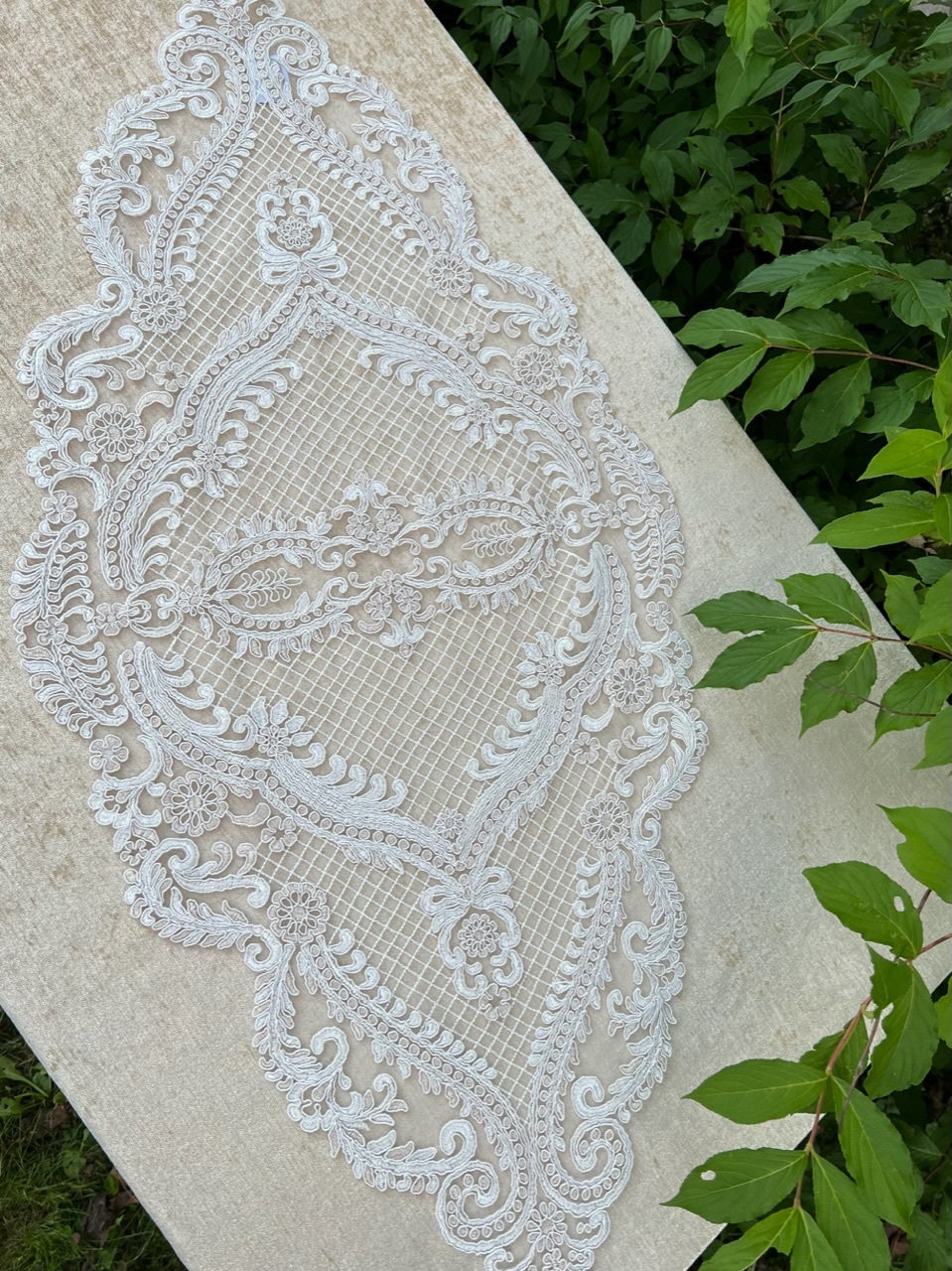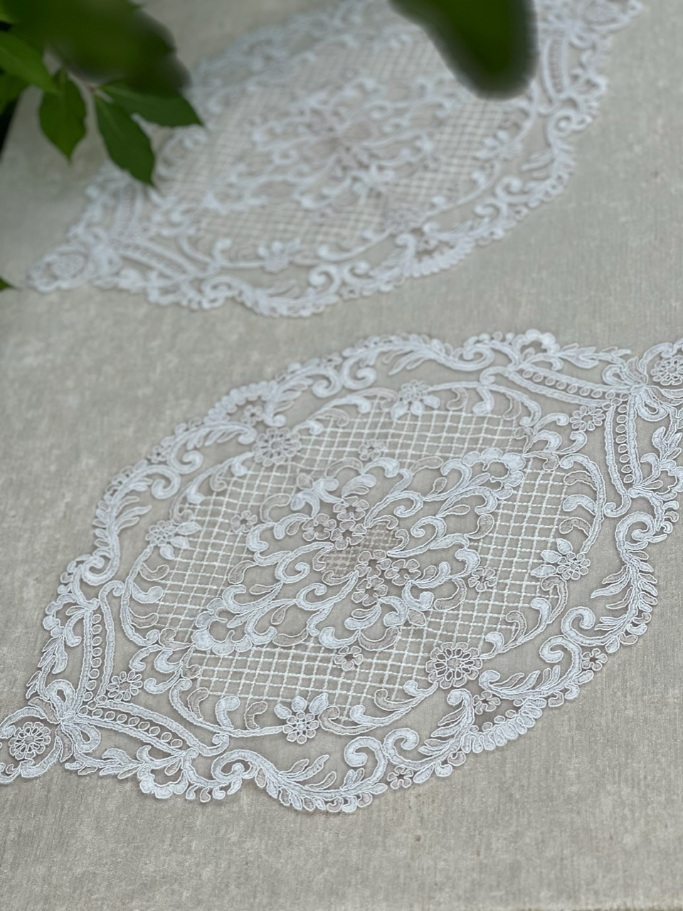Состав: 70% вискоза, 30% хлопок. Изящный, воздушный, кружевной набор. Великолепная вышивка объемными элементами по капроновой вуали, цвета аворио. Этот роскошный комплект (3 предметный) состоит из кружевной дорожки 95х45см и 2 кружевных салфеток 35х50 см. Для этой линейки используется ткань с особым видом кружевного плетения из вискозы и хлопка, что делает изделия прочными и долговечными.
