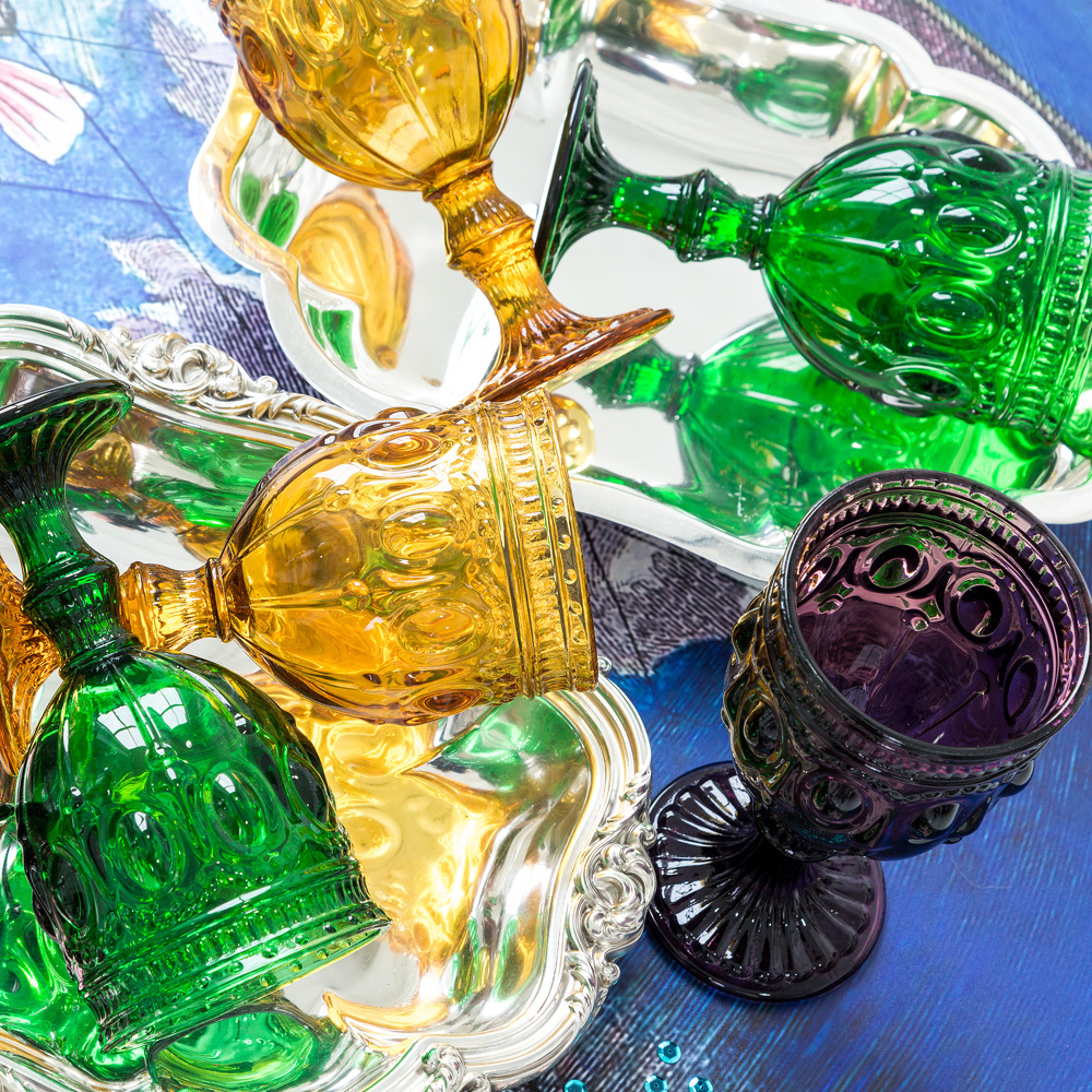 Что общего между классической архитектурой и цветными стеклянными фужерами Кабошон? Это не просто красивое название. В каплевидных выпуклых гранях бокала угадывается элемент хрустальной люстры. Кружевной орнамент напоминает изысканные резные панели стен, детали канделябров или картинных рам. Подобная игра ассоциаций причудлива и затейлива. В ней немудрено погрузиться в атмосферу светского приема и затеряться в цветном лабиринте прекрасной эпохи прошлых столетий. Фужеры Кабошон изготовлены из светопрозрачного стекла, свойства которого близки к хрусталю. Обильный узор чутко реагируют на свет, - кубок переливается и отсвечивает яркими бликами. В свете люстр атмосфера застолья наполняется торжеством, при вечернем свете - согревает романтикой. Комплект из 6-ти штук включает по 2 фужера 3-х цветов: топаз, турмалин, аметист.