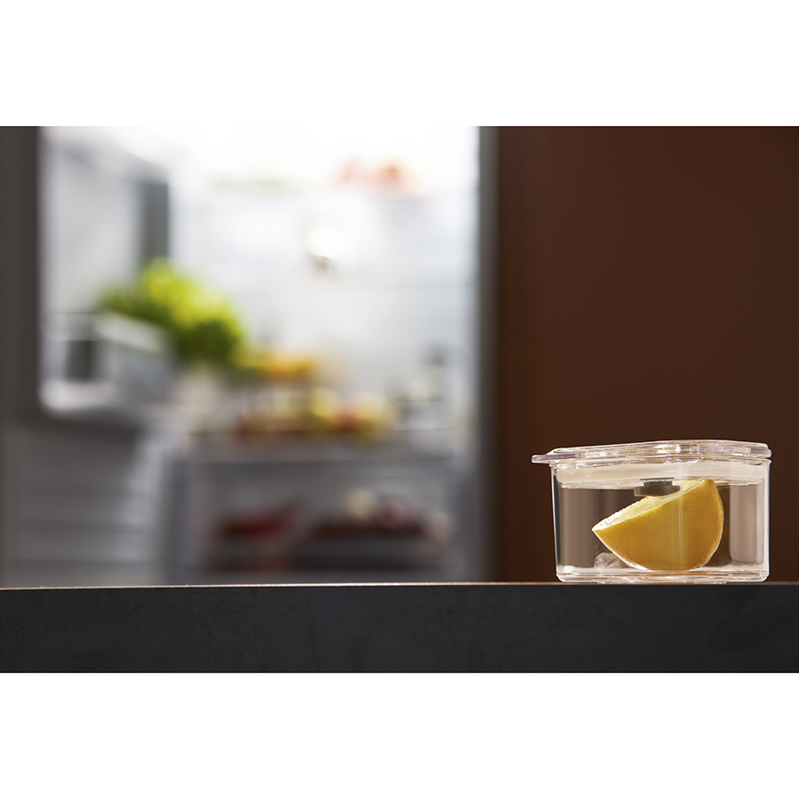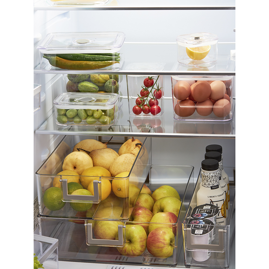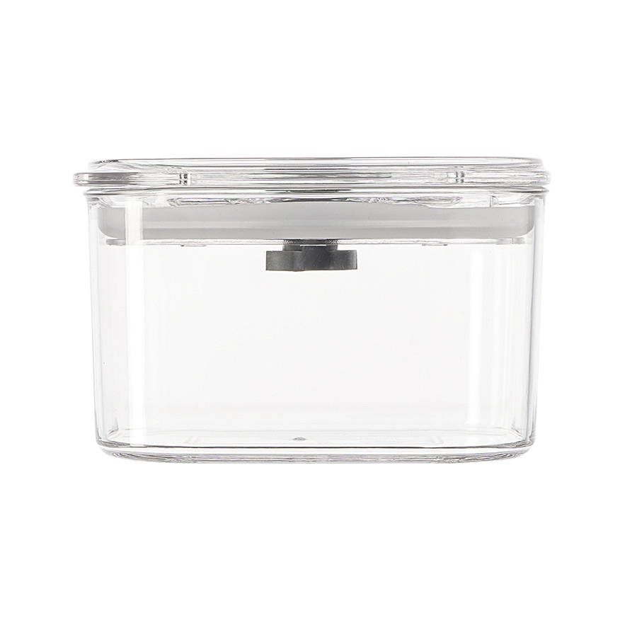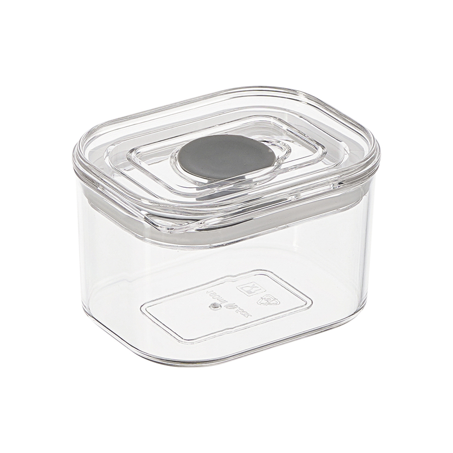 - Контейнер выполнен из SAN-пластика, который обладает высокой прочностью, не впитывает запахи и не вступает в химическую реакцию с продуктами.