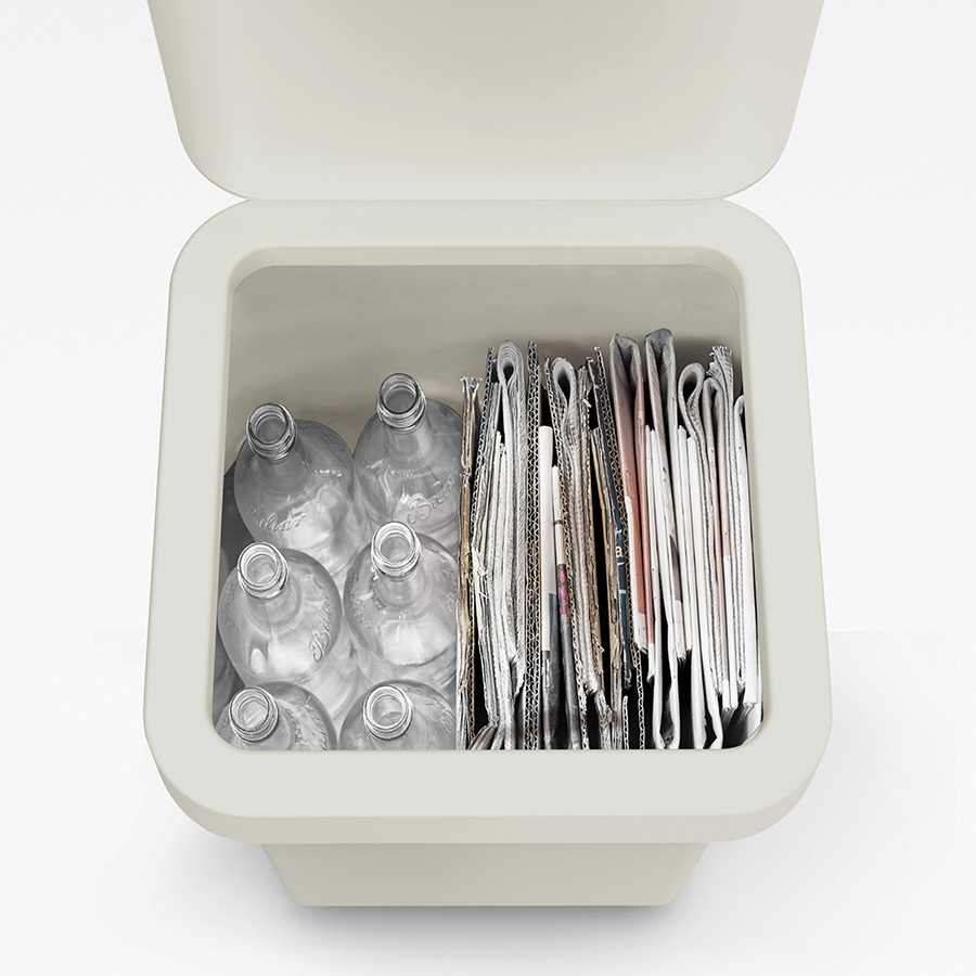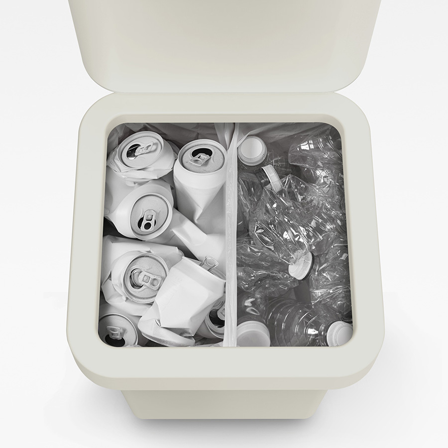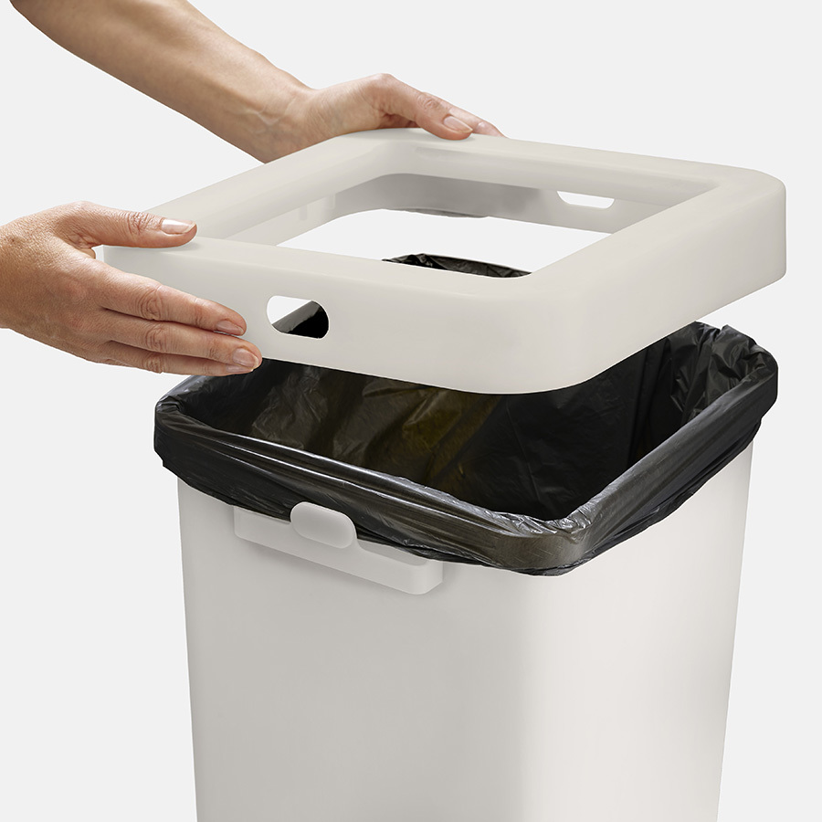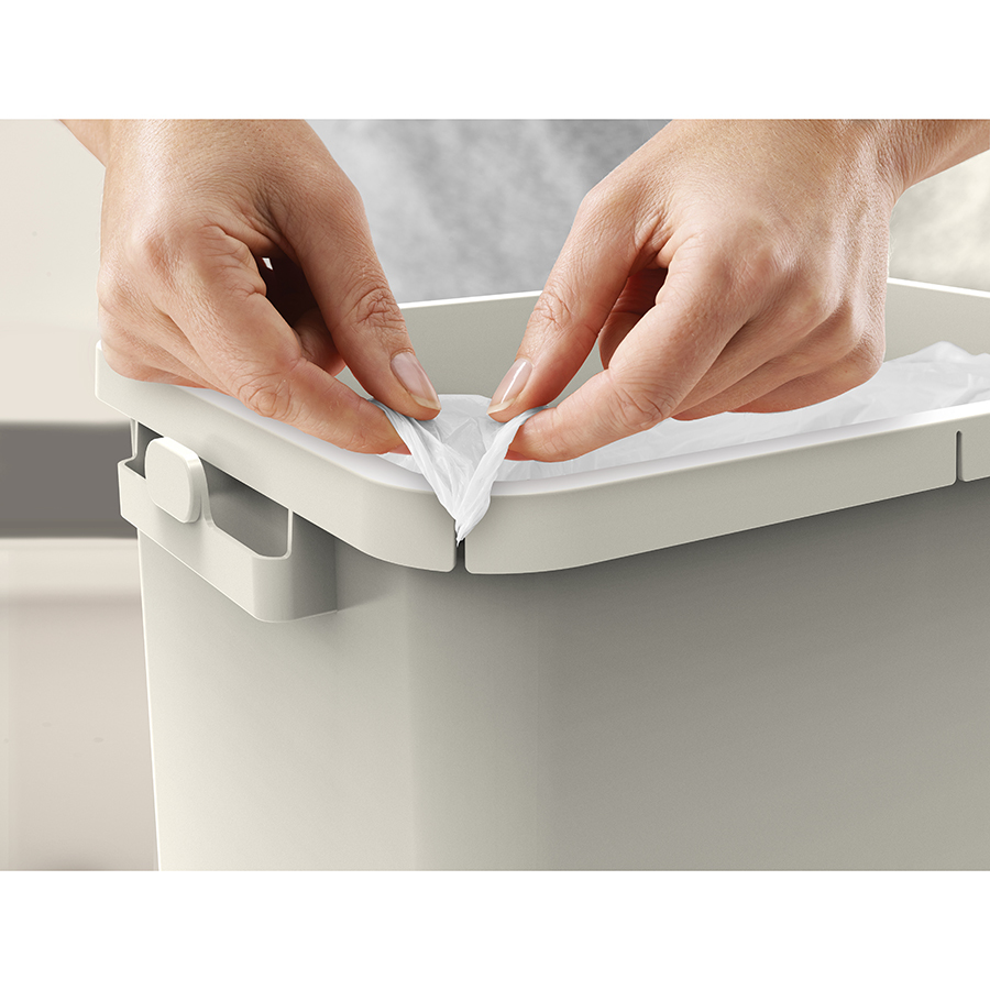 Отделения представляют собой вместительные стальные контейнеры объемом по 20 л, для которых можно использовать как стандартные, так и специально разработанные пакеты. Конструкция позволяет надежно закреплять внутри мусорные пакеты, а вентилируемые отверстия помогают быстро извлекать их по мере наполнения. Верхний бак дополнен съемным ведром с отверстиями и крючками для крепления мусорных пакетов. Нижний бак можно использовать не только для накопления мусора, но и хранения пакетов и хозяйственных принадлежностей.