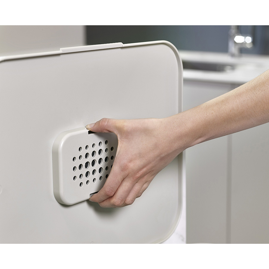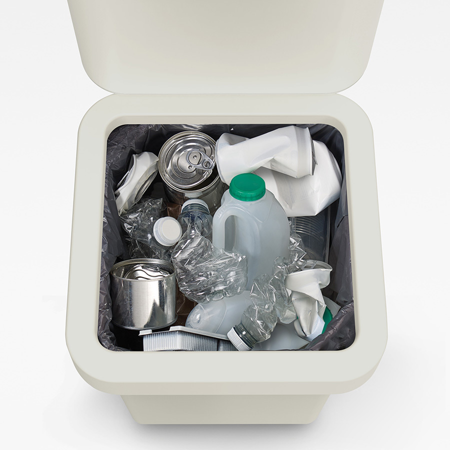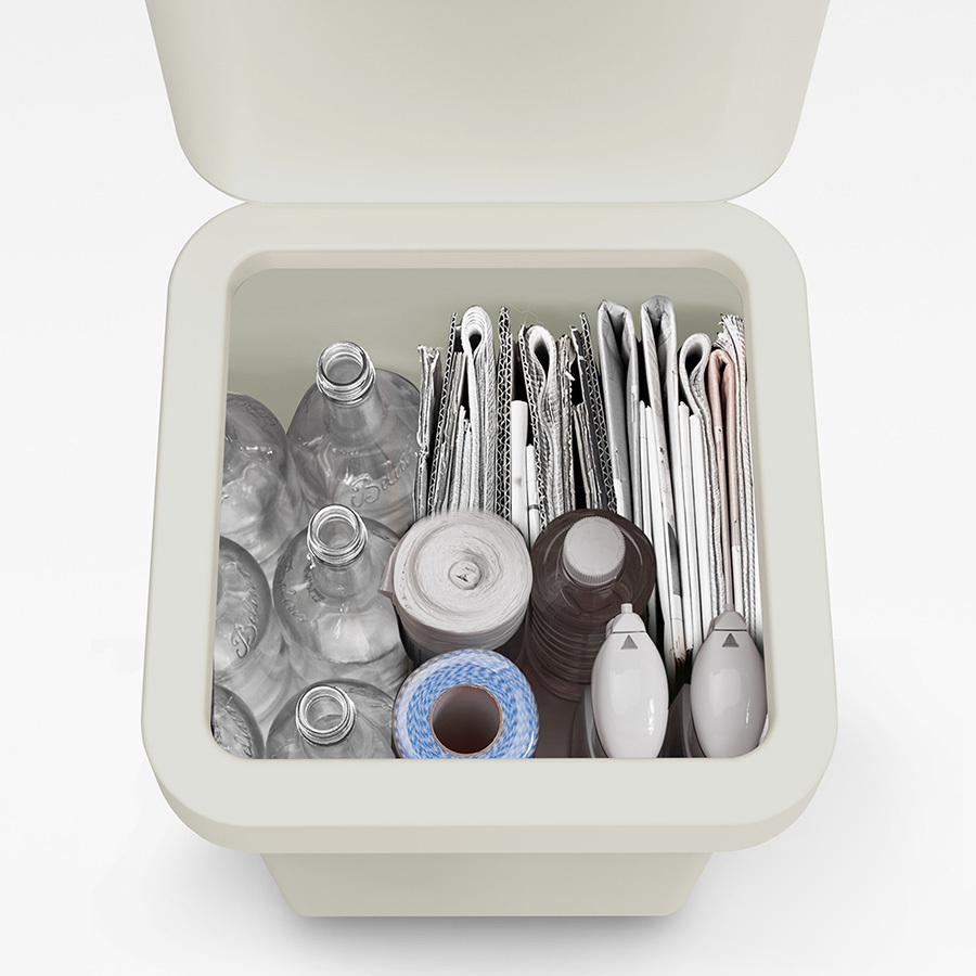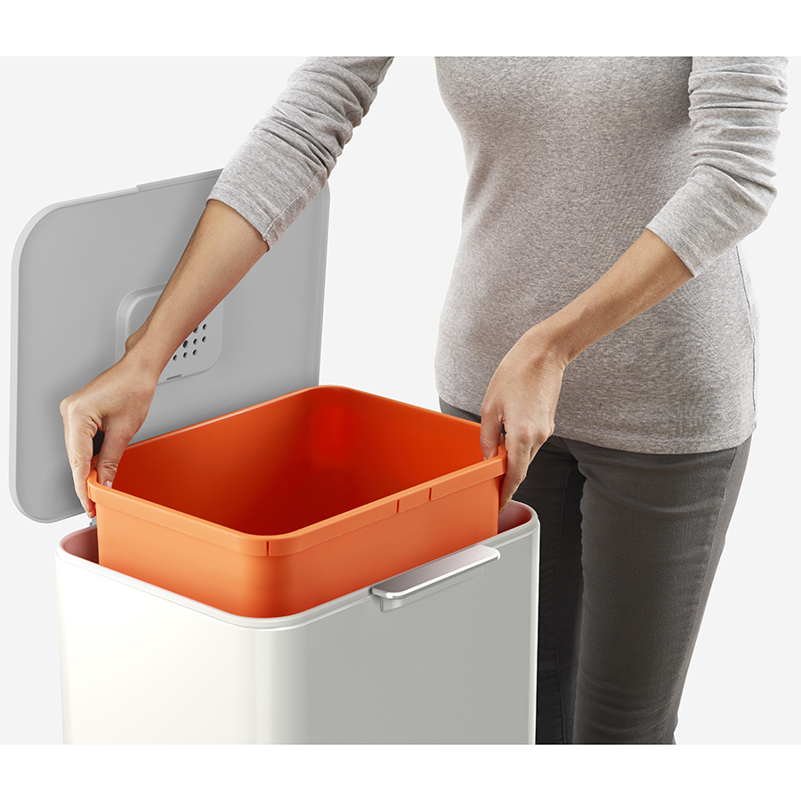 Отделения представляют собой вместительные стальные контейнеры объемом по 20 л, для которых можно использовать как стандартные, так и специально разработанные пакеты. Конструкция позволяет надежно закреплять внутри мусорные пакеты, а вентилируемые отверстия помогают быстро извлекать их по мере наполнения. Верхний бак дополнен съемным ведром с отверстиями и крючками для крепления мусорных пакетов. Нижний бак можно использовать не только для накопления мусора, но и хранения пакетов и хозяйственных принадлежностей.