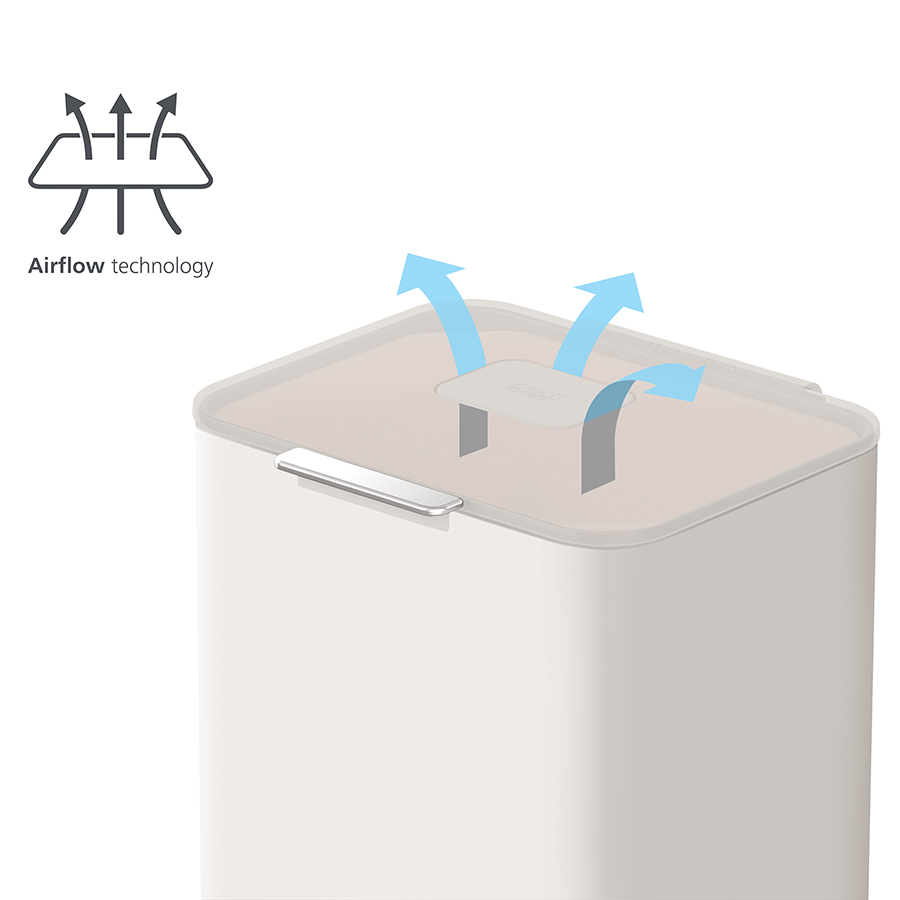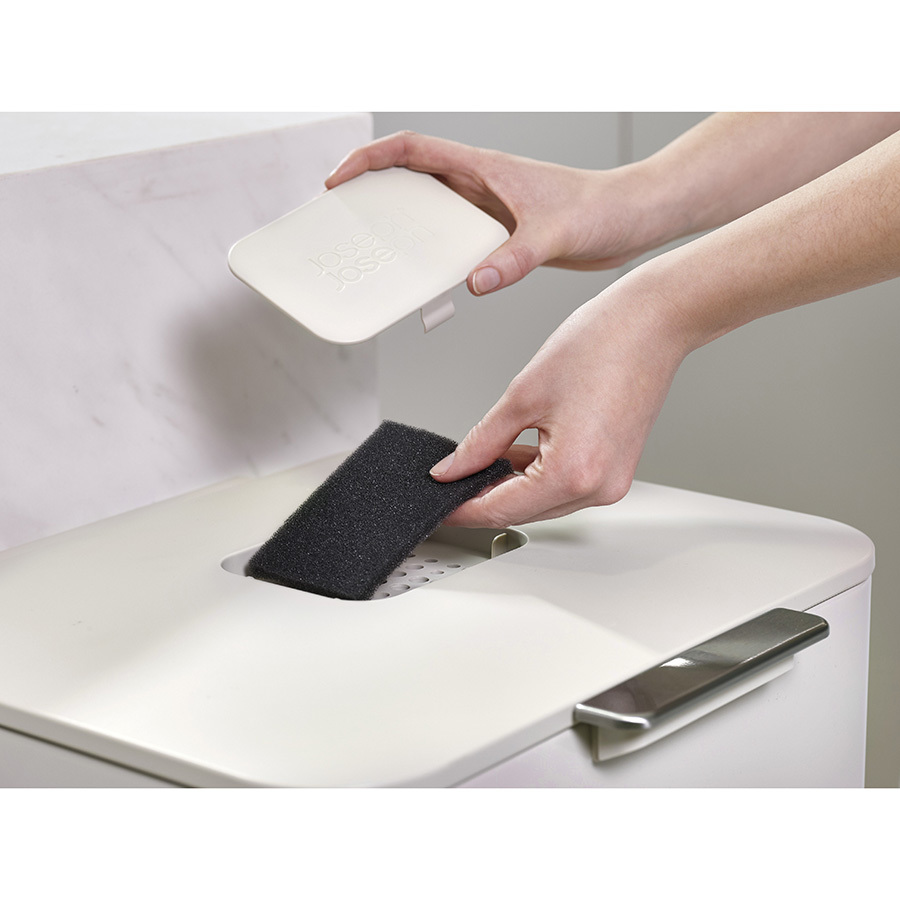 Внешняя крышка снабжена удобной кнопкой для легкого открывания контейнера. Также внутри нее крепится угольный фильтр, который эффективно блокирует неприятные запахи. Для поддержания чистоты баки рекомендуется регулярно мыть с мыльным раствором. Не используйте абразивные ткани или чистящие средства. Внешнюю поверхность контейнера следует протирать влажной тканью.