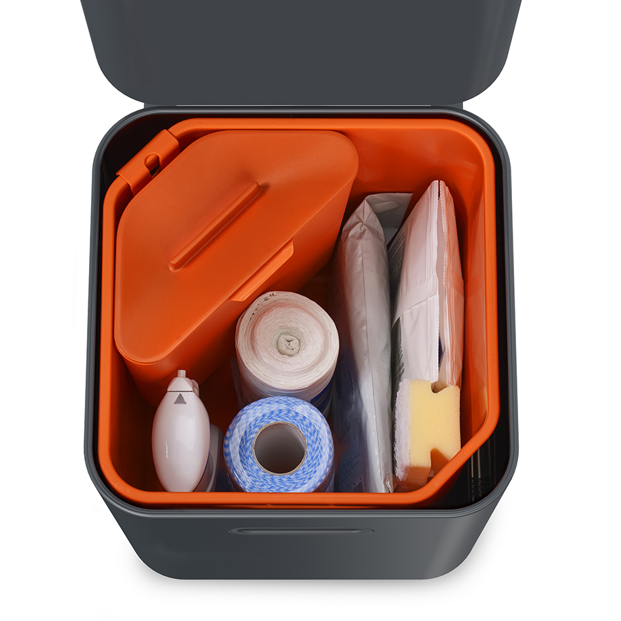 Верхний бак дополнен съемным контейнером для пищевых отходов, который плотно закрывается крышкой. Хранить его можно как внутри отсека, так и на рабочей поверхности. Нижний бак может использоваться не только для накопления мусора, но и хранения пакетов и хозяйственных принадлежностей.