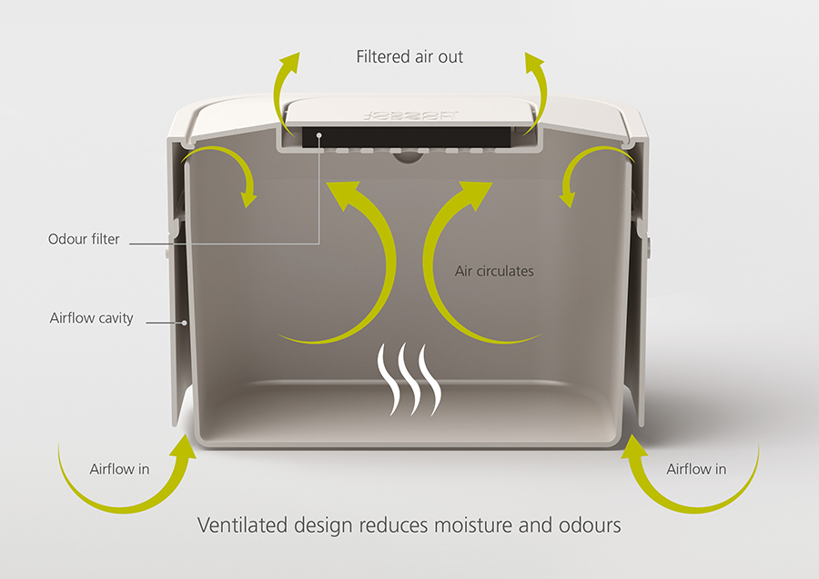 Контейнер, разработанный с целью минимизировать возникновение неприятных запахов от пищевых отходов. Инновационная вентилируемая конструкция позволяет воздуху циркулировать внутри емкости, что способствует уменьшению влажности. Освежающий фильтр впитывает неприятные запахи. Крышка плотно закрывается, не выпуская запахи наружу. Ручка из нержавеющей стали обеспечивает удобство при переноске. Таким образом, во время приготовления пищи контейнер можно установить на рабочий стол, а затем убрать в укромное место. Корпус из полипропилена очень легко очищается. Специальные отверстия и съемный ободок по краям контейнера аккуратно удерживают мусорный мешок.