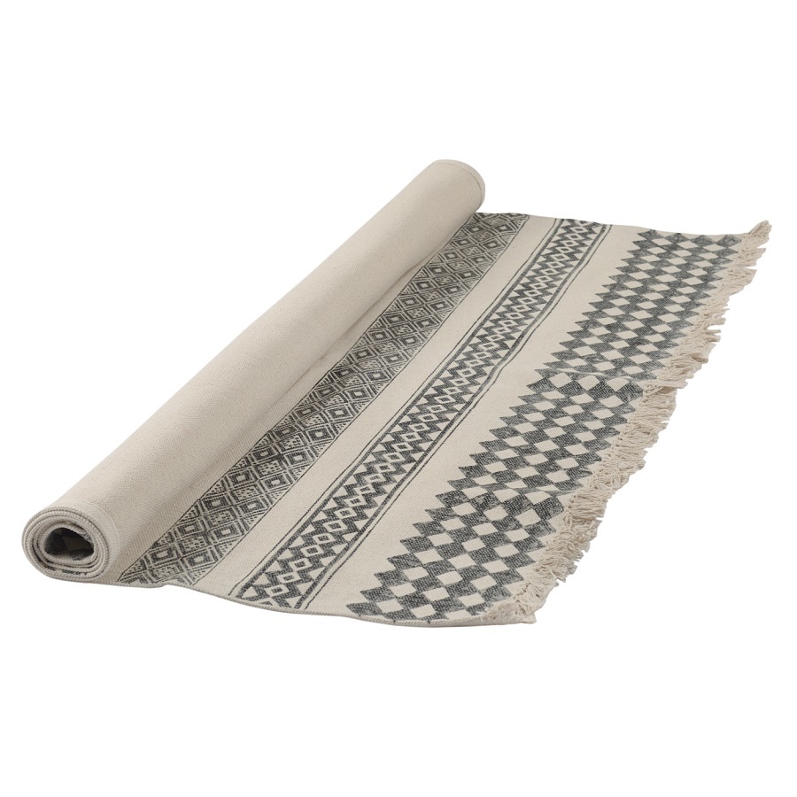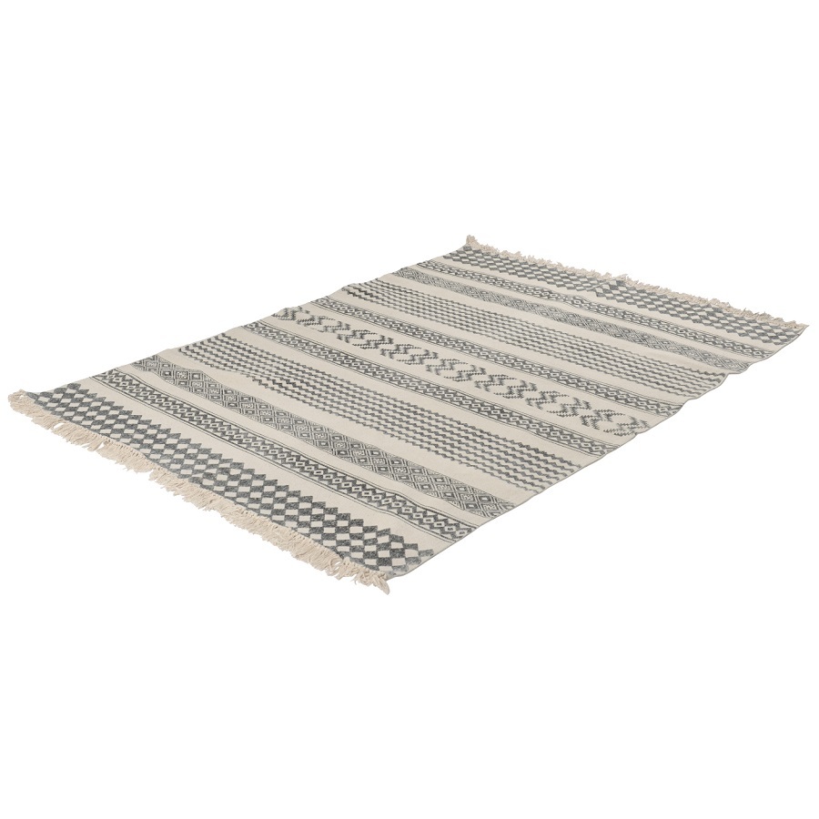Ковер из хлопка с контрастным орнаментом и бахромой из коллекции Ethnic нейтрального цвета дополнит любой современный интерьер. Он добавит уюта и станет акцентом в комнате. Оригинальное и практичное изделие из хлопка будет особенно уместно на полу в гостиной или в спальне. Ковер представлен в нескольких размерах.