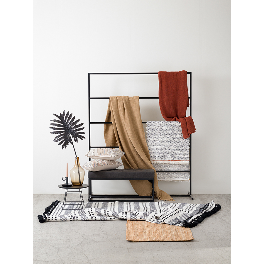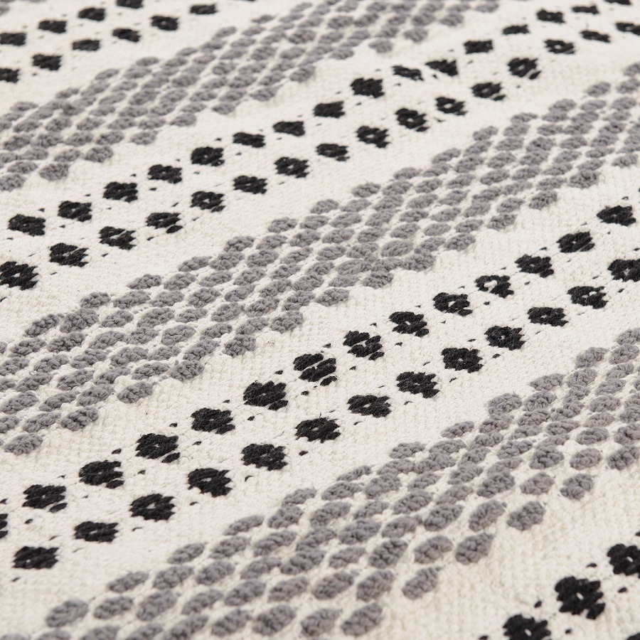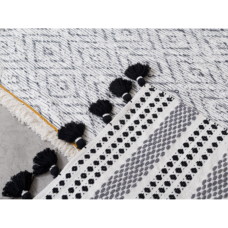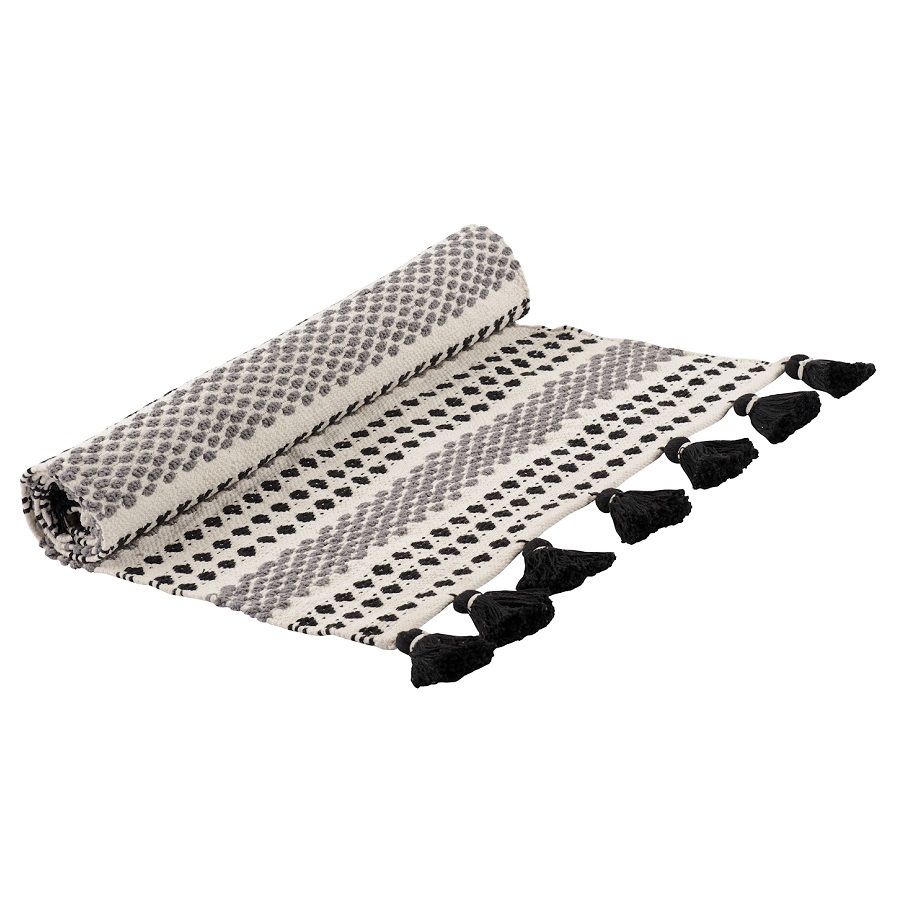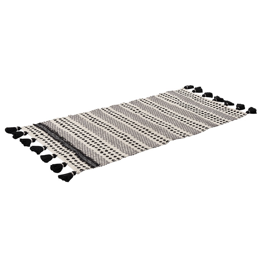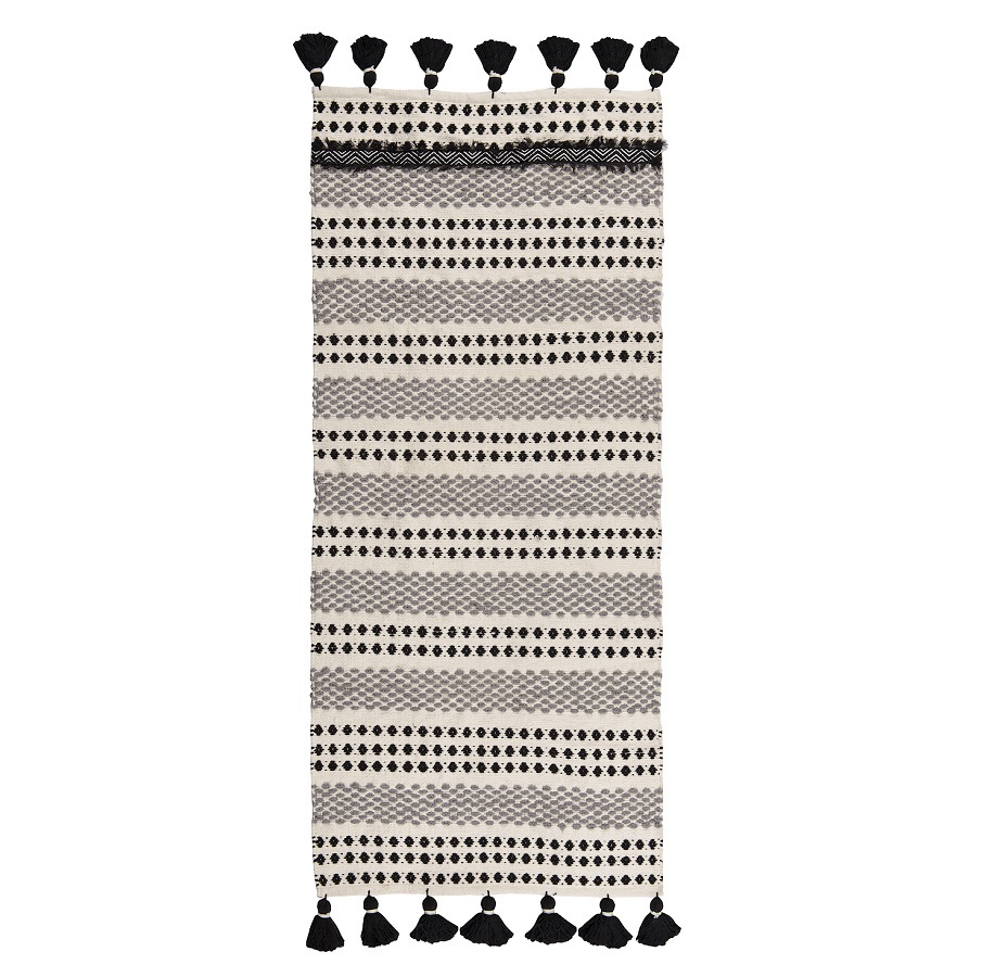 Ковер из хлопк Chennai из коллекции Ethnic декорирован контрастным линейным орнаментом черно-белого цвета и пышными кисточками с двух сторон. Он добавит уюта и станет акцентом в любом интерьере, от минимализма и сканди до бохо и фьюжн. Практичная модель из хлопка будет особенно уместна на полу в гостиной или в спальне. Ковер представлен в нескольких размерах.